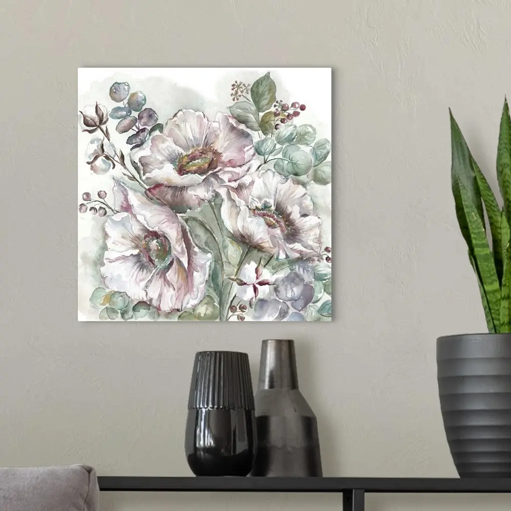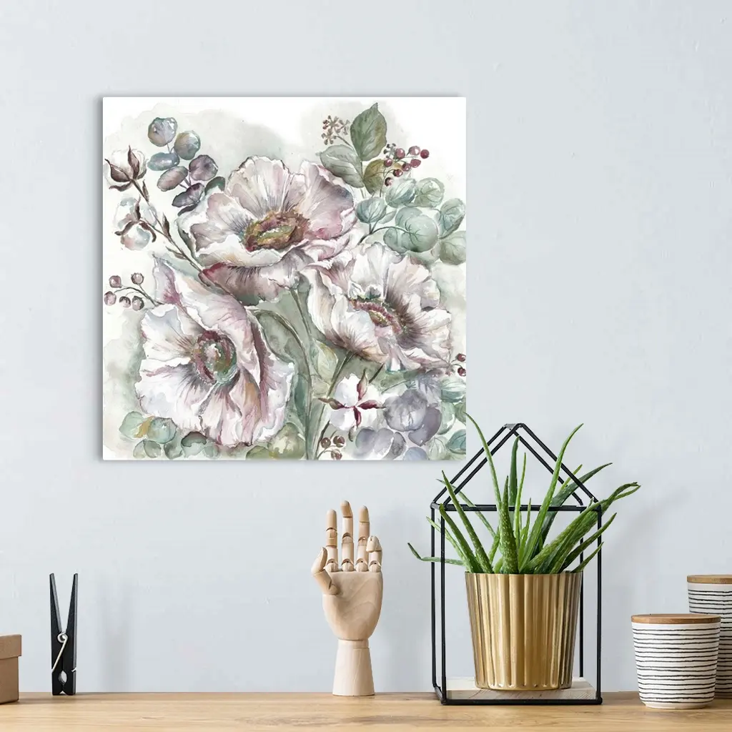 A decorative watercolor painting of a poppy and eucalyptus in subdue tones.