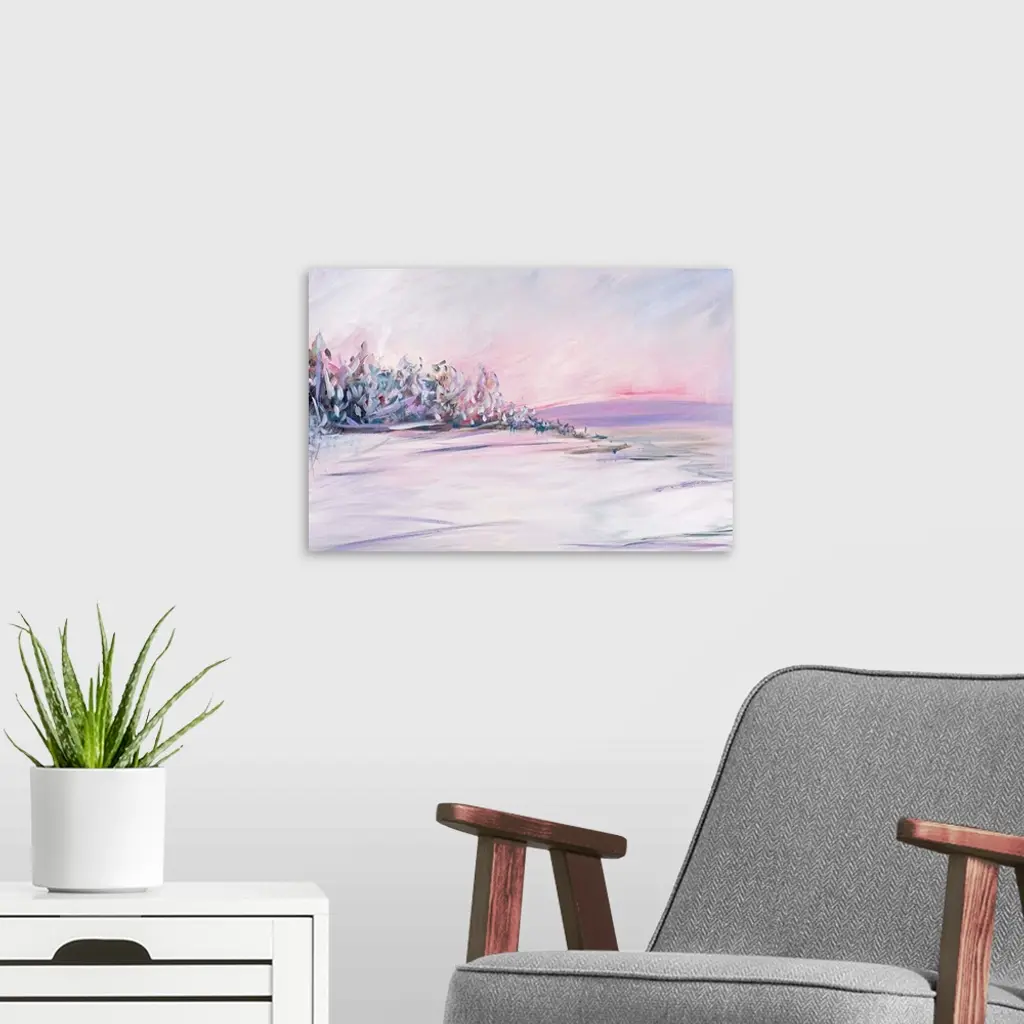 Contemporary landscape painting of a snow-covered field with trees lining the edge.