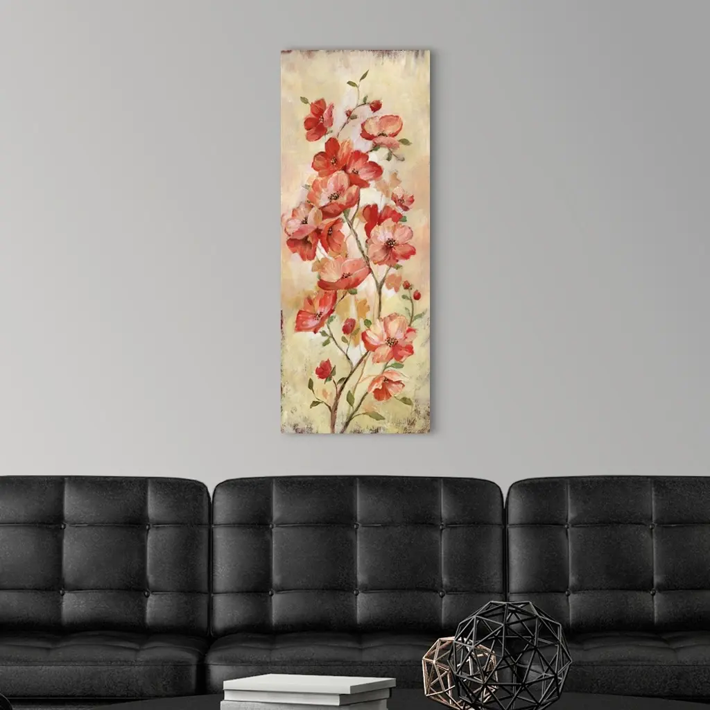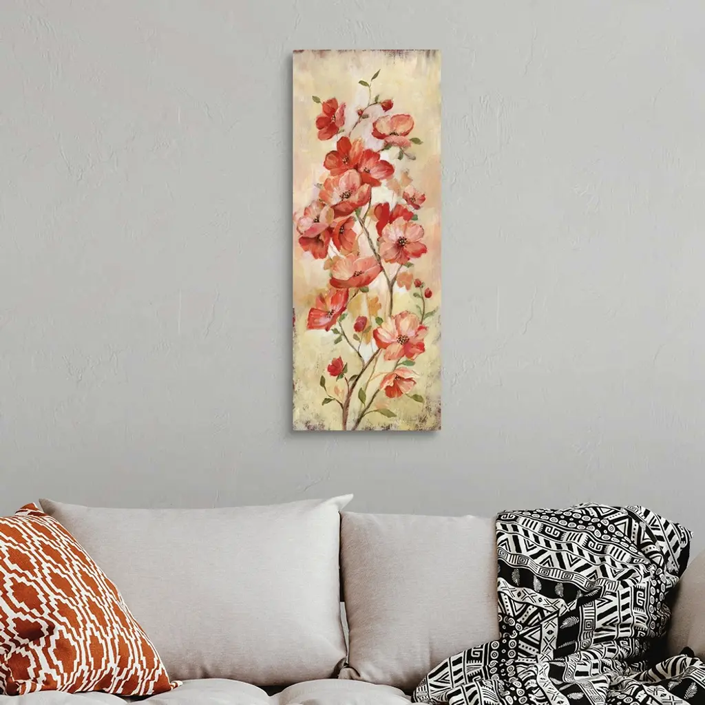 Tall panel painting of warm toned flowers growing upwards on a branch.