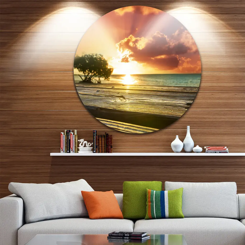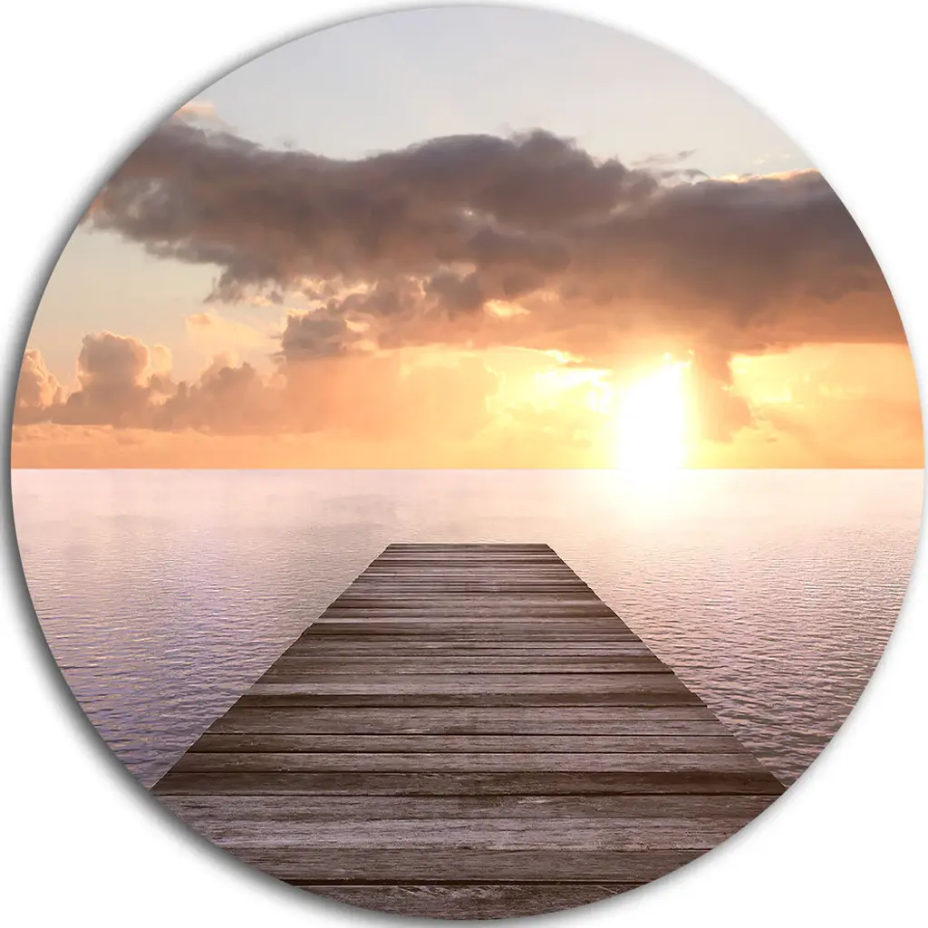 Boardwalk On Beach Under Cloudy Sky, Landscape Round Metal Artwork, 23"
