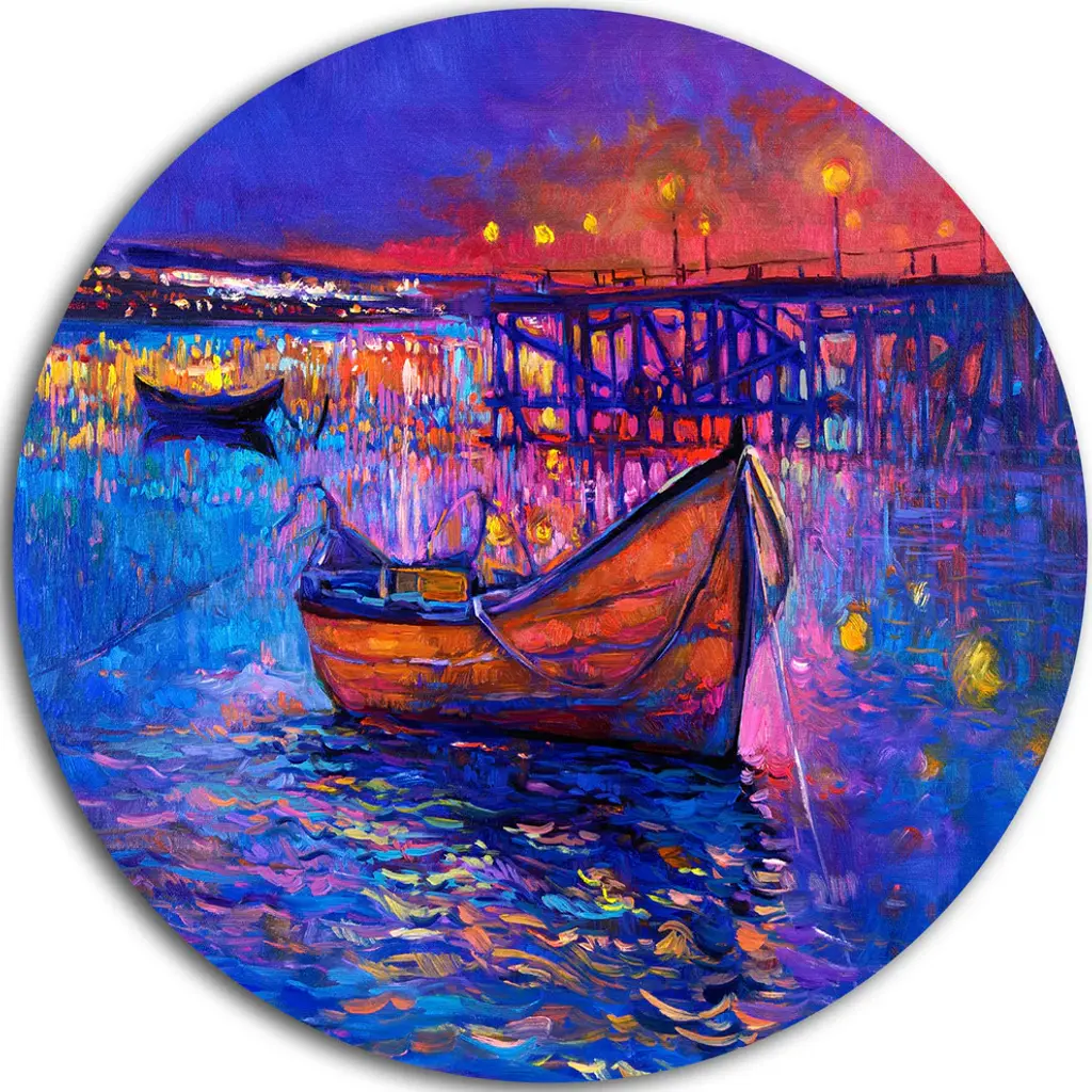 Bring Contemporary Abstraction to your home with this large Circle Metal wall art. This Boat and Pier in Yellow Shade Metal Artwork makes it the focal point of any room or office. - White Gloss Coating ensures colors are extra vibrant with light reflection.- Aluminum grade Sheet Metal with 1 inch mounting frame on the back giving the illusion that the artwork is floating on the wall..- Mounting Brackets are included along with instructions.- High Quality Digital images are created directly into a glossy aluminum panel producing a stunning and captivating print into the glossy finish of the metal.- Water, Fire and Scratch resistant HD Aluminum panels.- Looks better than any photo paper and guaranteed to last at least 20 years- Easy to clean with a microfiber cloth. Colors are far superior to regular Canvas Art. - Easy to Hang