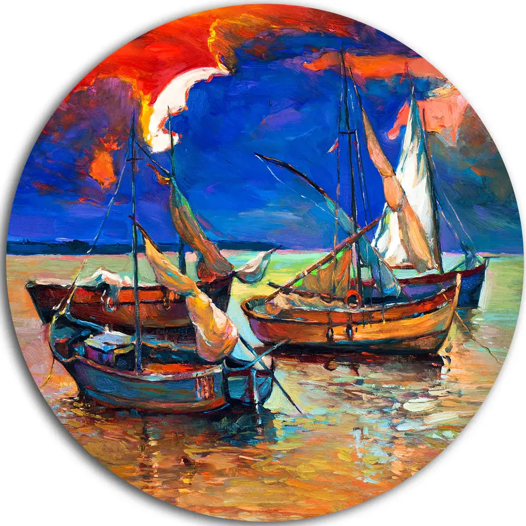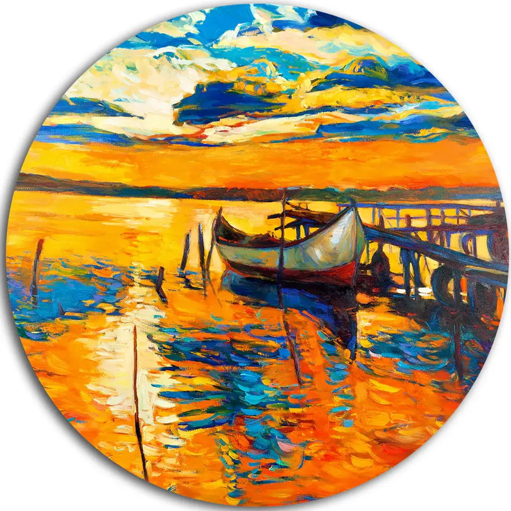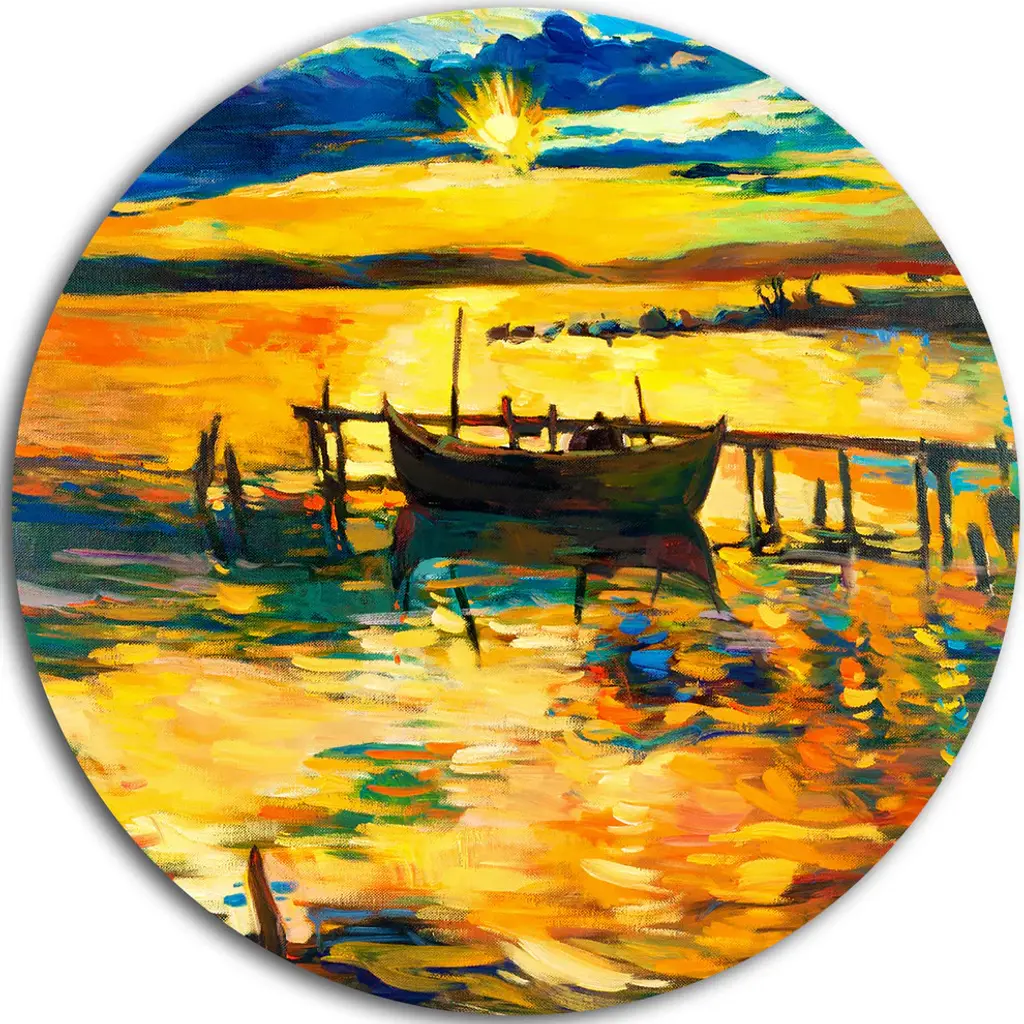 Boat And Pier In Yellow Shade, Seascape Painting Round Wall Art, 23"