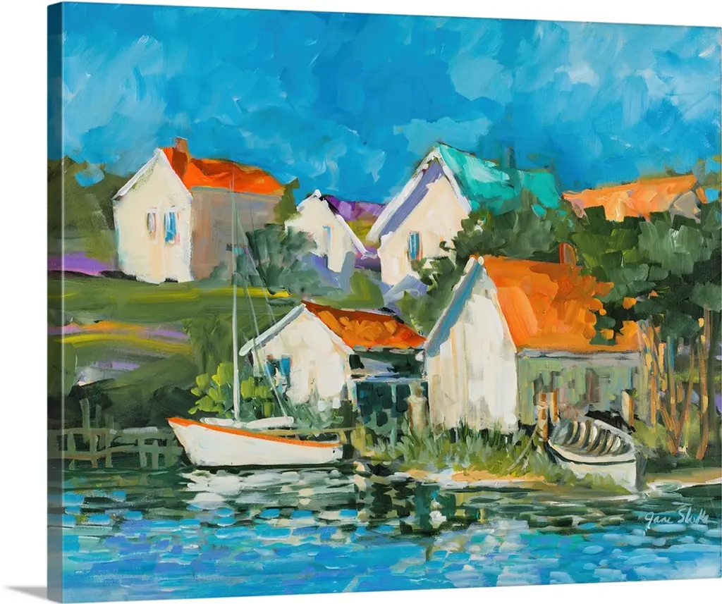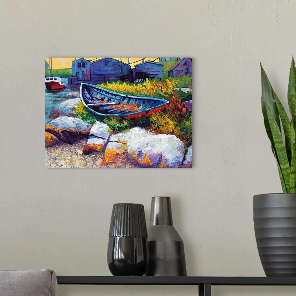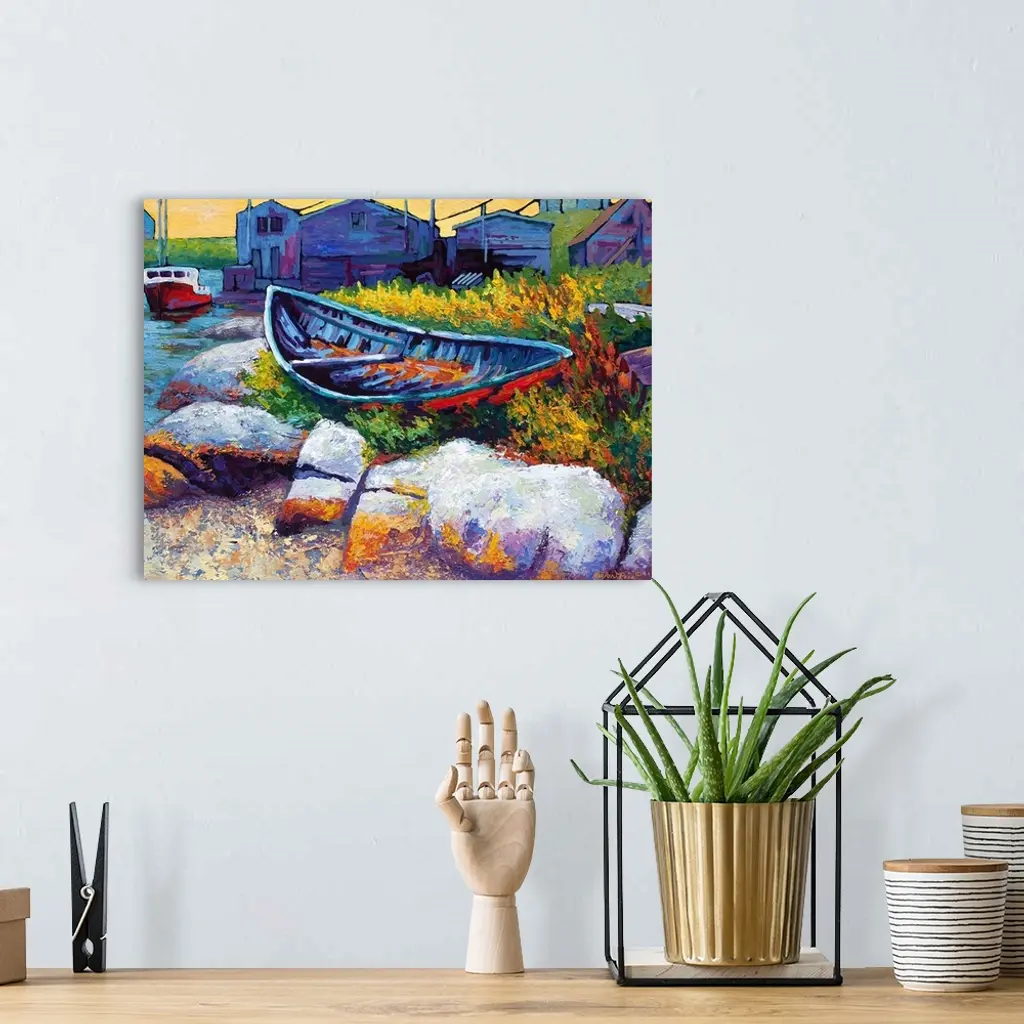 Colorful contemporary painting of a row boat sitting in a patch of grass on a pile of rocks with buildings in the distance at sunset.