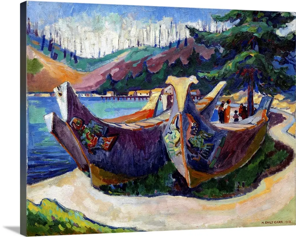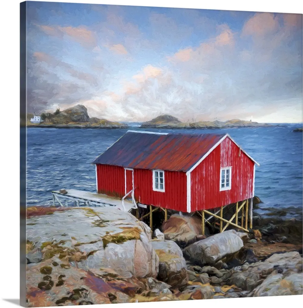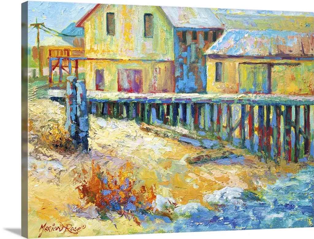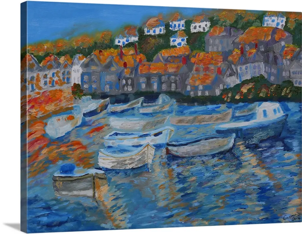 Colorful contemporary painting of a row boat sitting in a patch of grass on a pile of rocks with buildings in the distance at sunset.