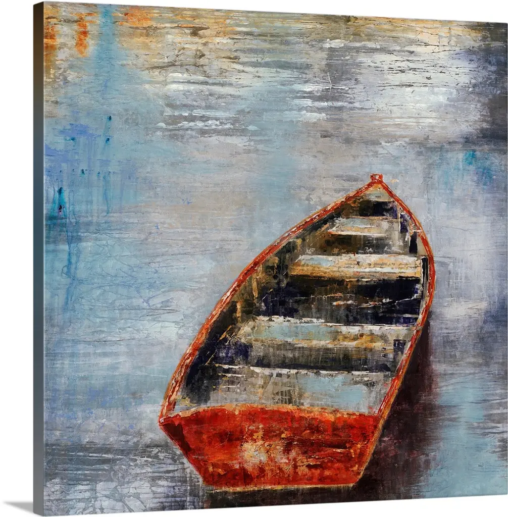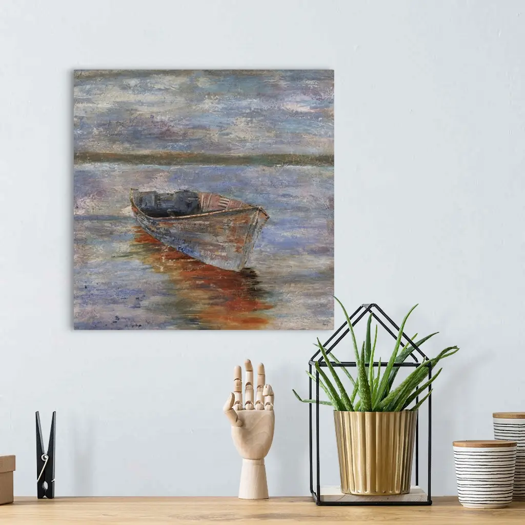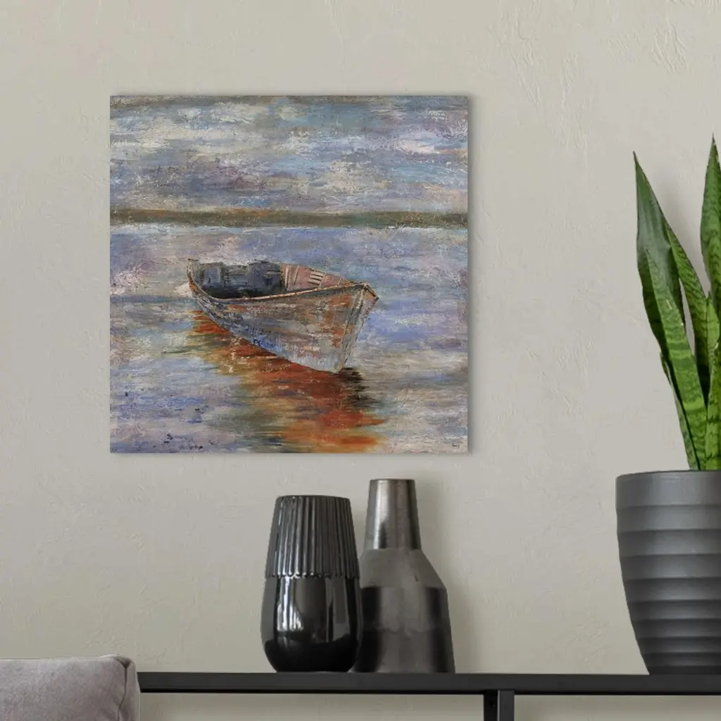 Painting of an empty row boat sitting in calm waters at sunset, a distant mountain range can be seen on the horizon.