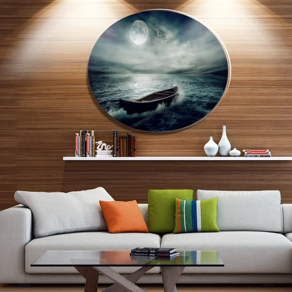 Boat Drifting Away After Storm, Seashore Round Metal Wall Art, 23"