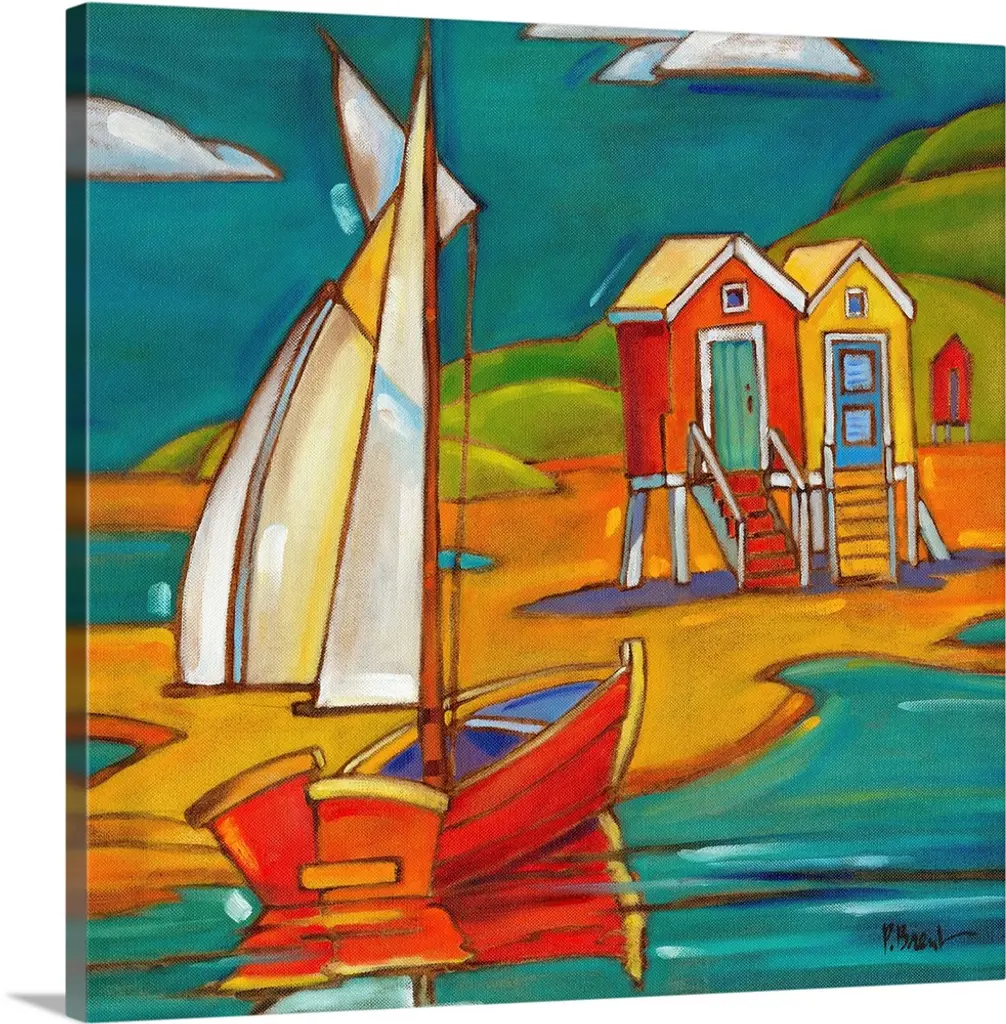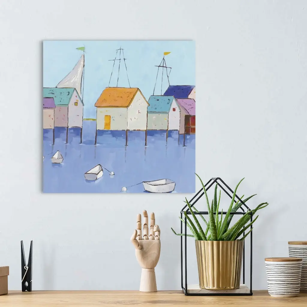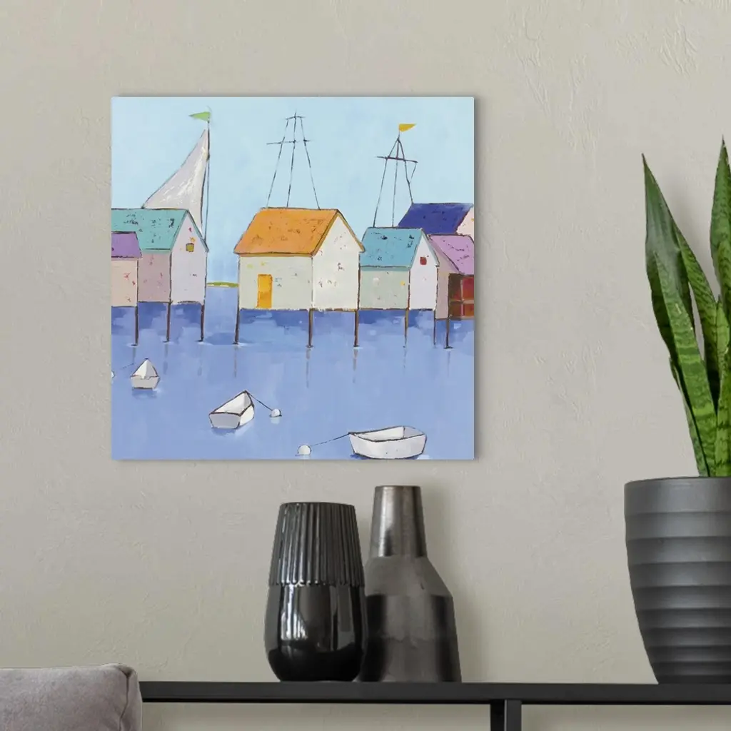 Contemporary painting of a row of colorful waterfront boat houses with multiple row boats and sailboats scattered around.