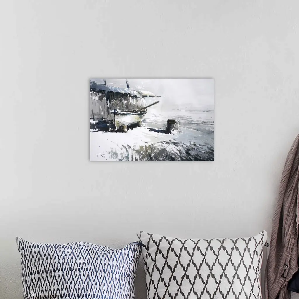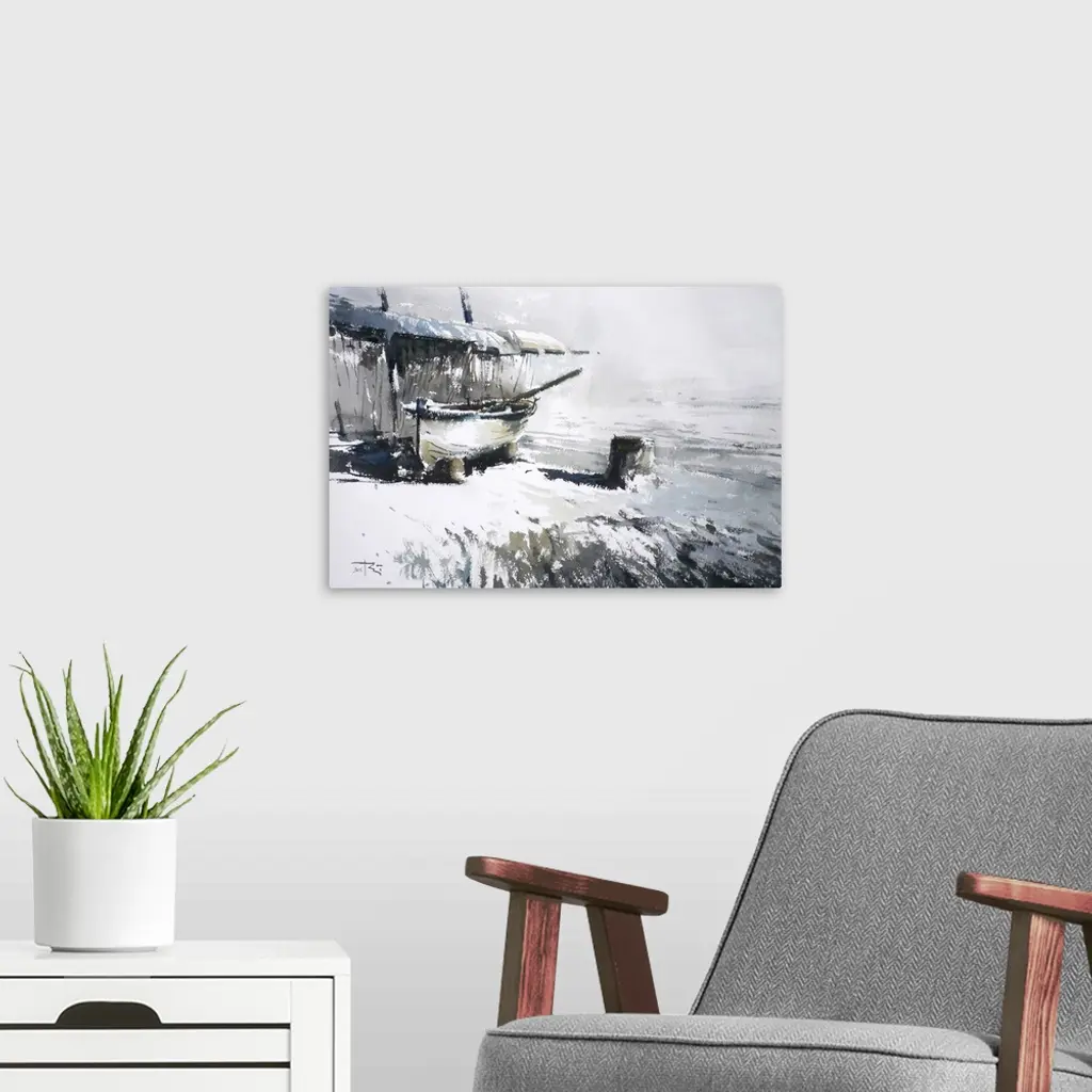 This contemporary artwork highlights snow covered surfaces near an old boat under a shed.