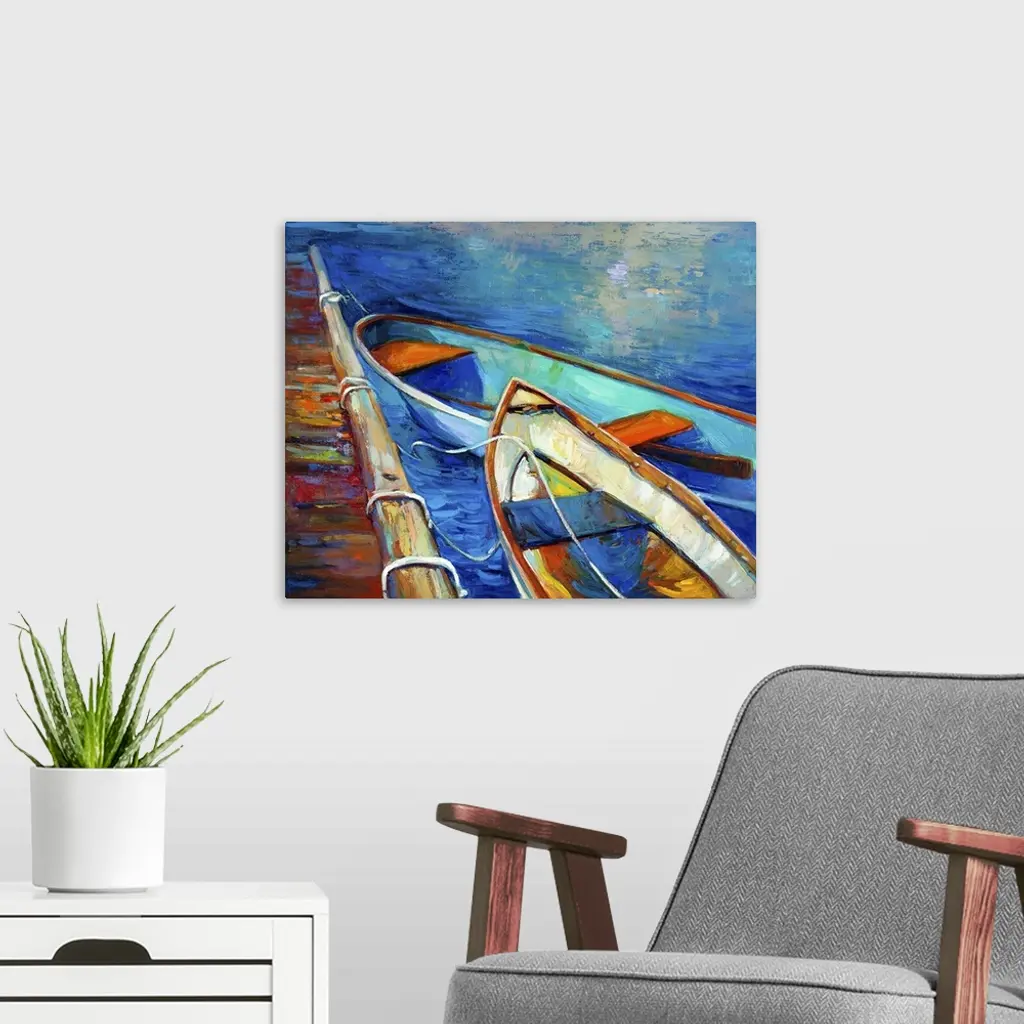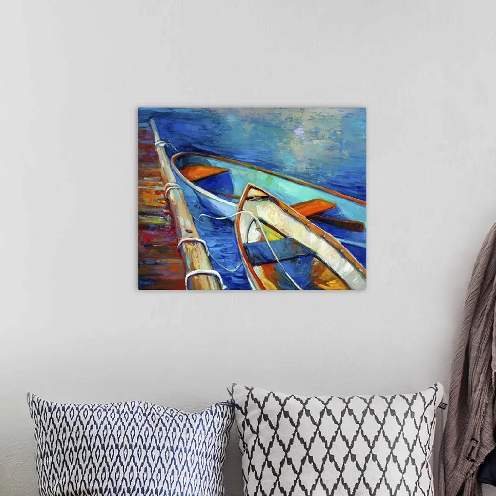 Originally an oil painting of boat and jetty (pier) on canvas. Sunset over ocean. Modern impressionism.