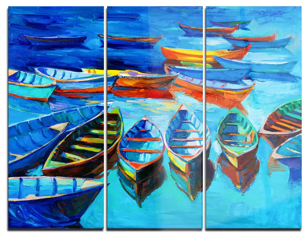 "Boats And Pier In Blue Shade" Painting Metal Wall Art, 3 Panels, 36"x28"