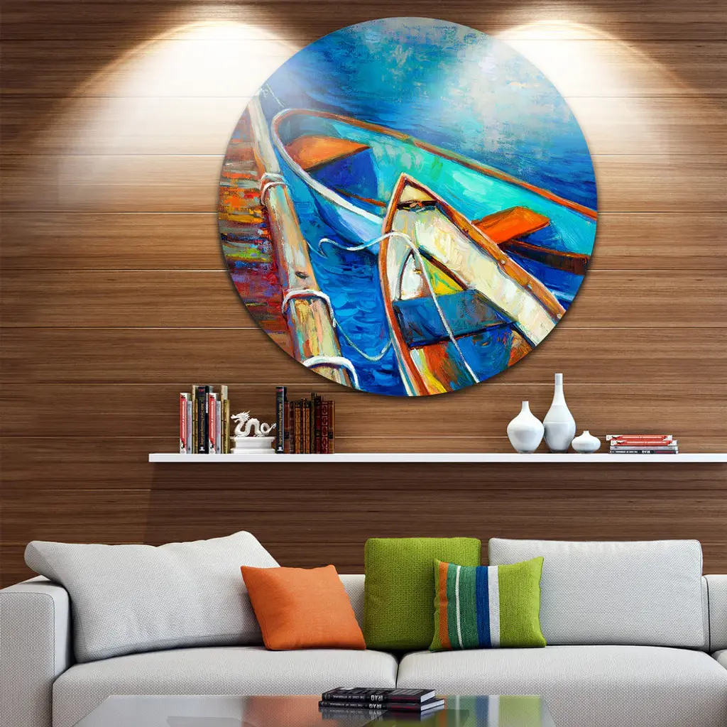 Boats And Pier In Blue Shade, Seascape Round Metal Wall Art, 38"