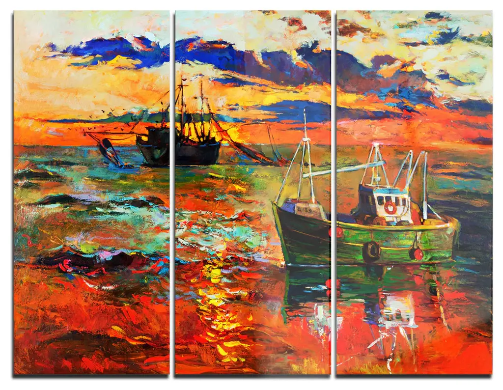 "Boats And The City" Painting Metal Wall Art, 3 Panels, 36"x28"