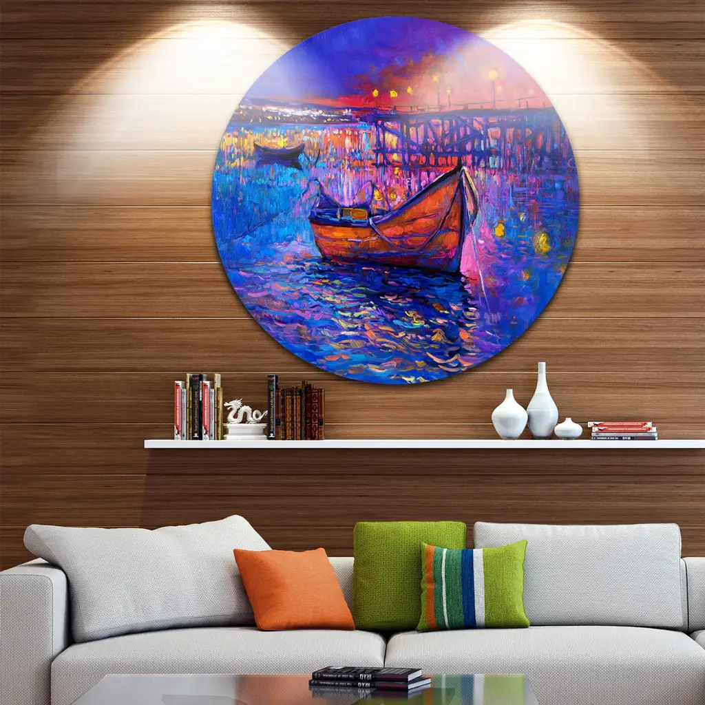 Bring Contemporary Abstraction to your home with this large Circle Metal wall art. This Boats and the City Metal Artwork makes it the focal point of any room or office. - White Gloss Coating ensures colors are extra vibrant with light reflection.- Aluminum grade Sheet Metal with 1 inch mounting frame on the back giving the illusion that the artwork is floating on the wall..- Mounting Brackets are included along with instructions.- High Quality Digital images are created directly into a glossy aluminum panel producing a stunning and captivating print into the glossy finish of the metal.- Water, Fire and Scratch resistant HD Aluminum panels.- Looks better than any photo paper and guaranteed to last at least 20 years- Easy to clean with a microfiber cloth. Colors are far superior to regular Canvas Art. - Easy to Hang