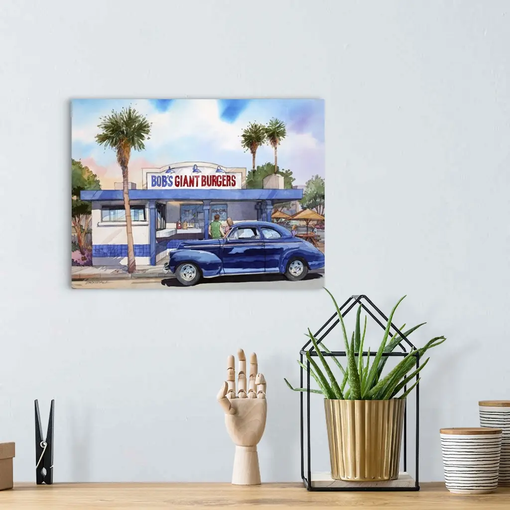 Watercolor painting of a 41 Chevy parked at Bob's Hamburger Stand in Fremont, CA.