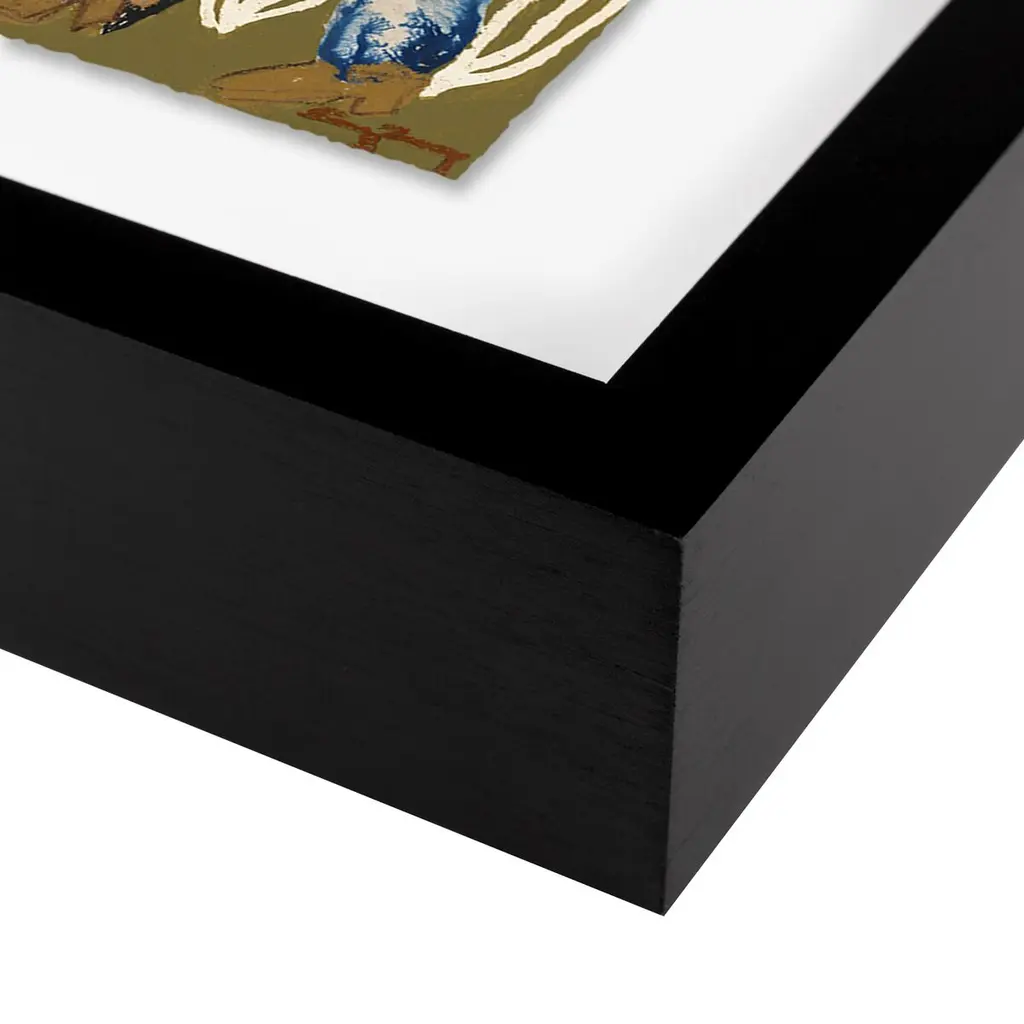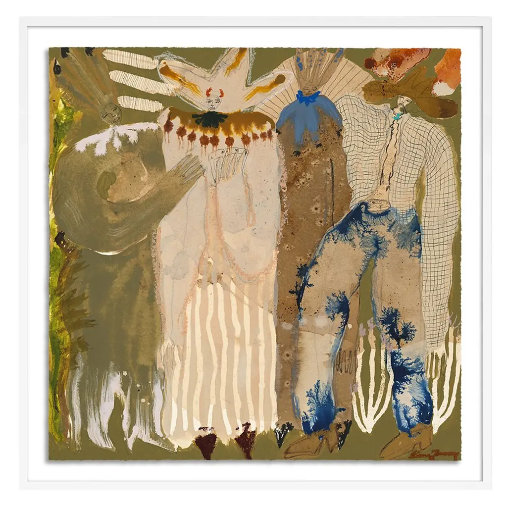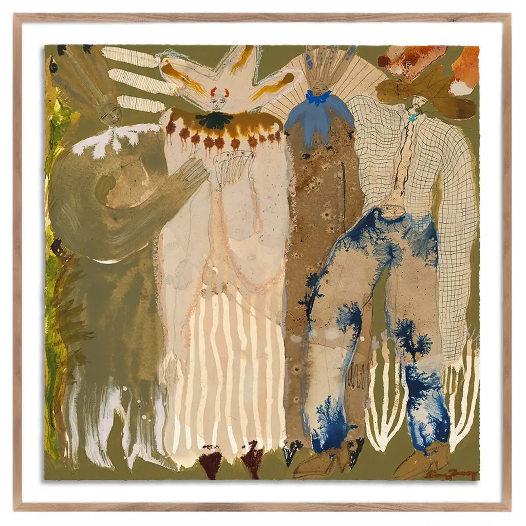 Austin figurative painter Caroline Pinney explores intimacy and human relationships in her art brut-evocative pieces. Working with a range of mediums, from oil stick and charcoal to coffee and spray paint, she often uses her own hand to manipulate materials. Printed on premium paper and float-mounted within a rustic walnut frame. Handmade in Austin, Texas.