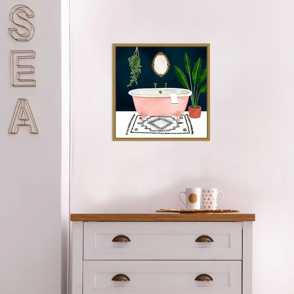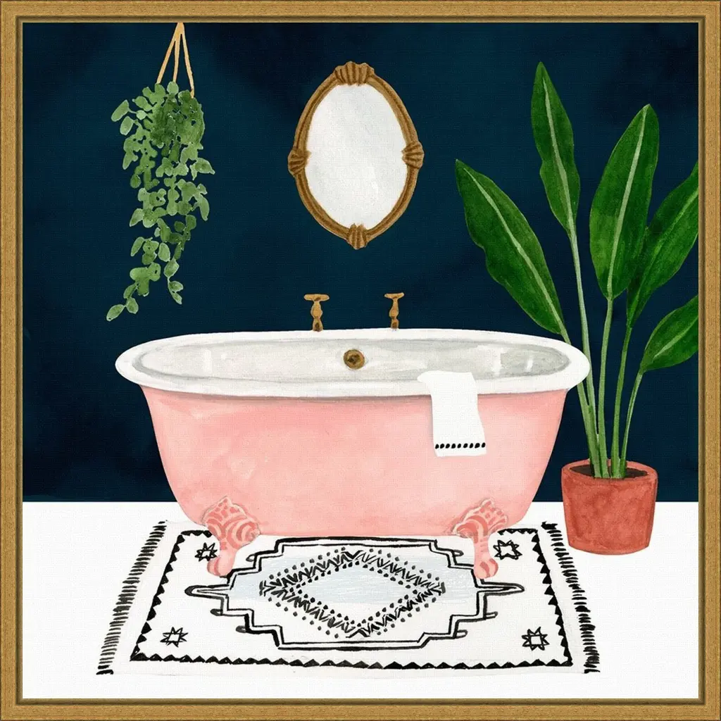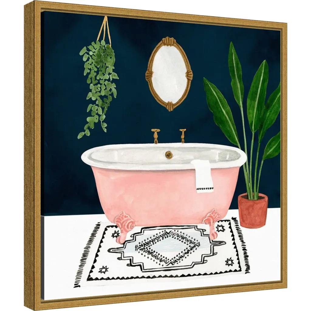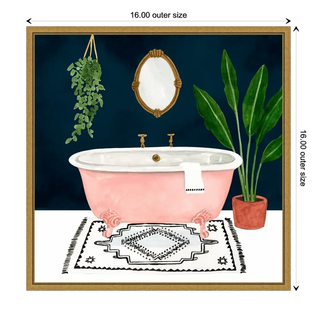 A clawfoot tub in pale pink beckons you to step inside and relax in a bathroom setting that includes lush green plants against a navy blue wall that holds an antique mirror centered above the tub.Features:FLOAT FRAMED CANVAS ART: Canvas is framed in a floated style that showcases a narrow gap between the edge of the gallery wrapped canvas and the frame. The wrapped canvas appears as if it's "floating" on the frame. The overall look is clean, modern and upscale.QUALITY: Canvas is printed with high quality, fade-resistant inks and stretched to hide corner folds. Canvas is stretched across a solid surface to resist sagging.AUTHENTICITY: Canvas is printed and professionally framed in Madison, Wisconsin USA with authentically licensed artwork.EFFORTLESS HANGING: Ready to hangfor easy installation. The metal sawtooth hangers come attached on the inset back for easy wall display.CUSTOM PACKAGED: Canvas is custom packaged for protection in shipment to arrive without damage.Details:Artist: Victoria BorgesTitle: Boho Bath IIProduct type: Framed Canvas BoxStyle: Modern ContemporaryFormat: squareSize: SmallSubject: Still LifeFrame: Sylvie Gold .5"Image dimensions: 14.50 inches high x 14.50 inches wideOutside dimensions: 16 inches high x 16 inches wide x 1.875 inches deep
