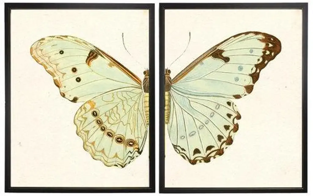 Split pale green butterfly in copper and black shadowbox. 2 frames make up this set.