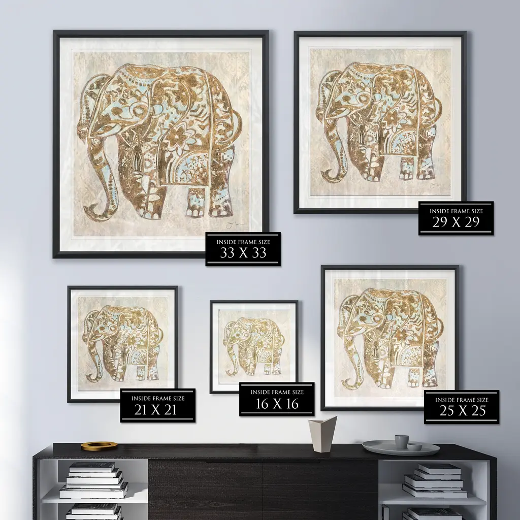 Boho Elephant -Framed Giclee Print A premium framed giclee print Printed using the last archival inks. Each print is carefully printed and framed by hand. Each piece features a 2'' Beveled matt board, acrylic glass and comes ready to hand. 5 SIZES AVILABLE 16''x16''- Overall Size 24''x22''- Overall Size 28''x28''' - Overall Size 32''x32''' - Overall Size 38''x38'' - Overall Size ** Overall size may vary slightly from piece to piece Each piece is made to order. Built to Last Each piece comes ready to hang Archival Ink 2'' Matt Board Assembled by hand in the America