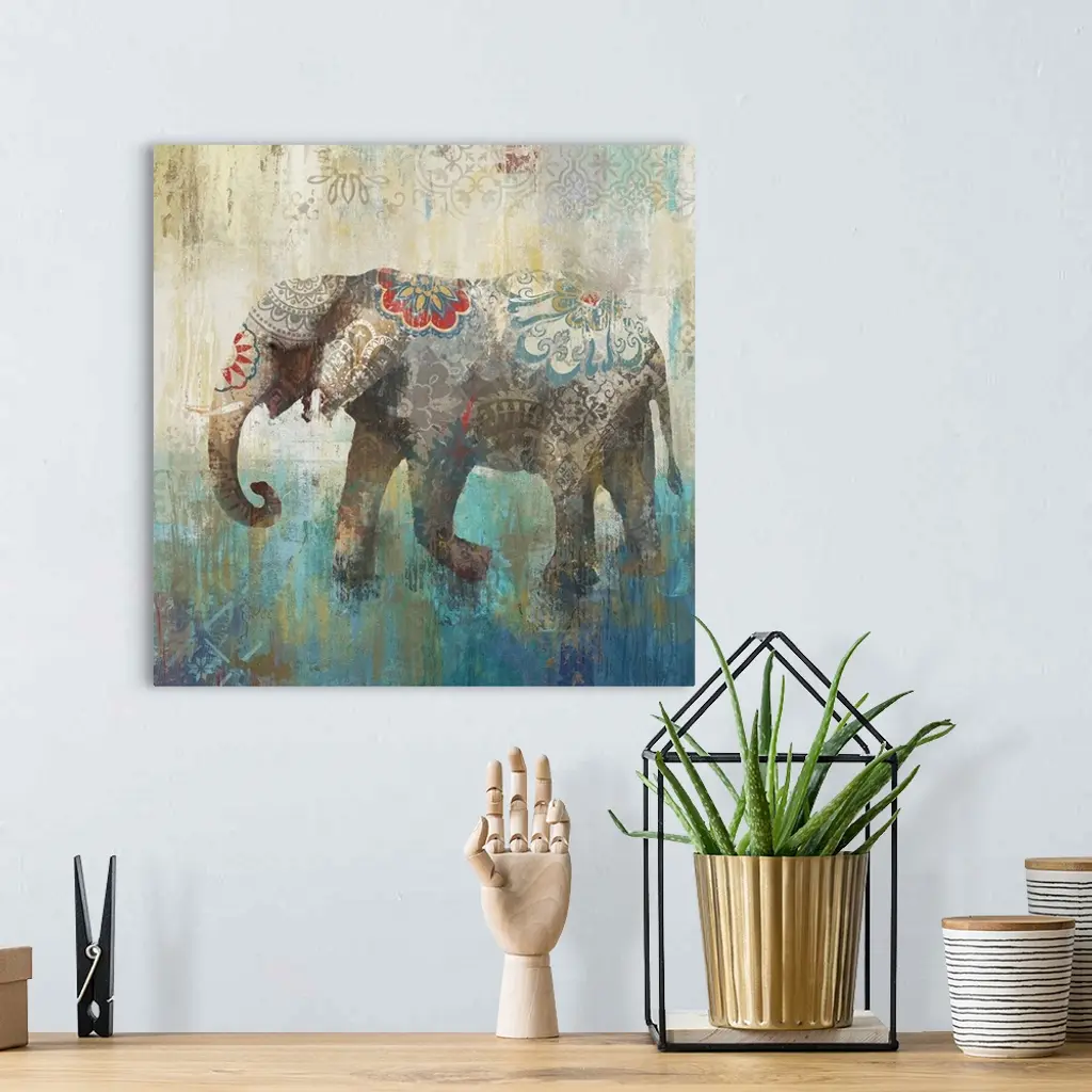 Decorative artwork of an elephant with tusk with a distressed overlay of colored brush strokes and floral designs.