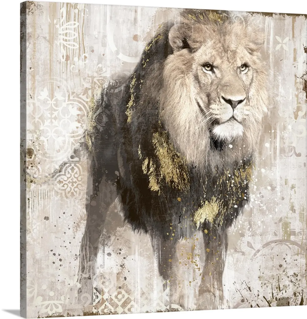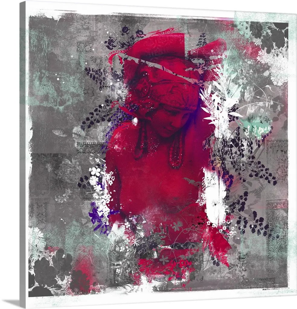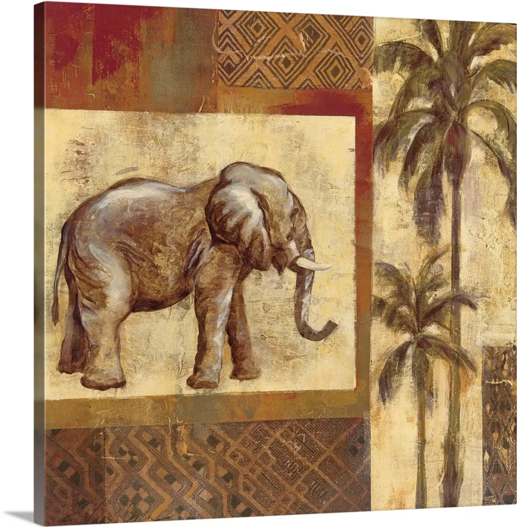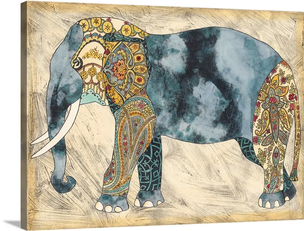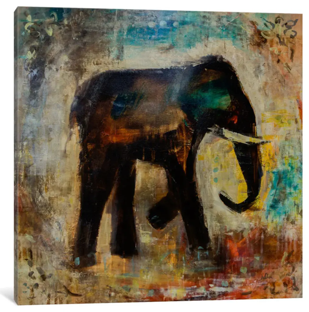 Decorative artwork of an elephant with tusk with a distressed overlay of colored brush strokes and floral designs.