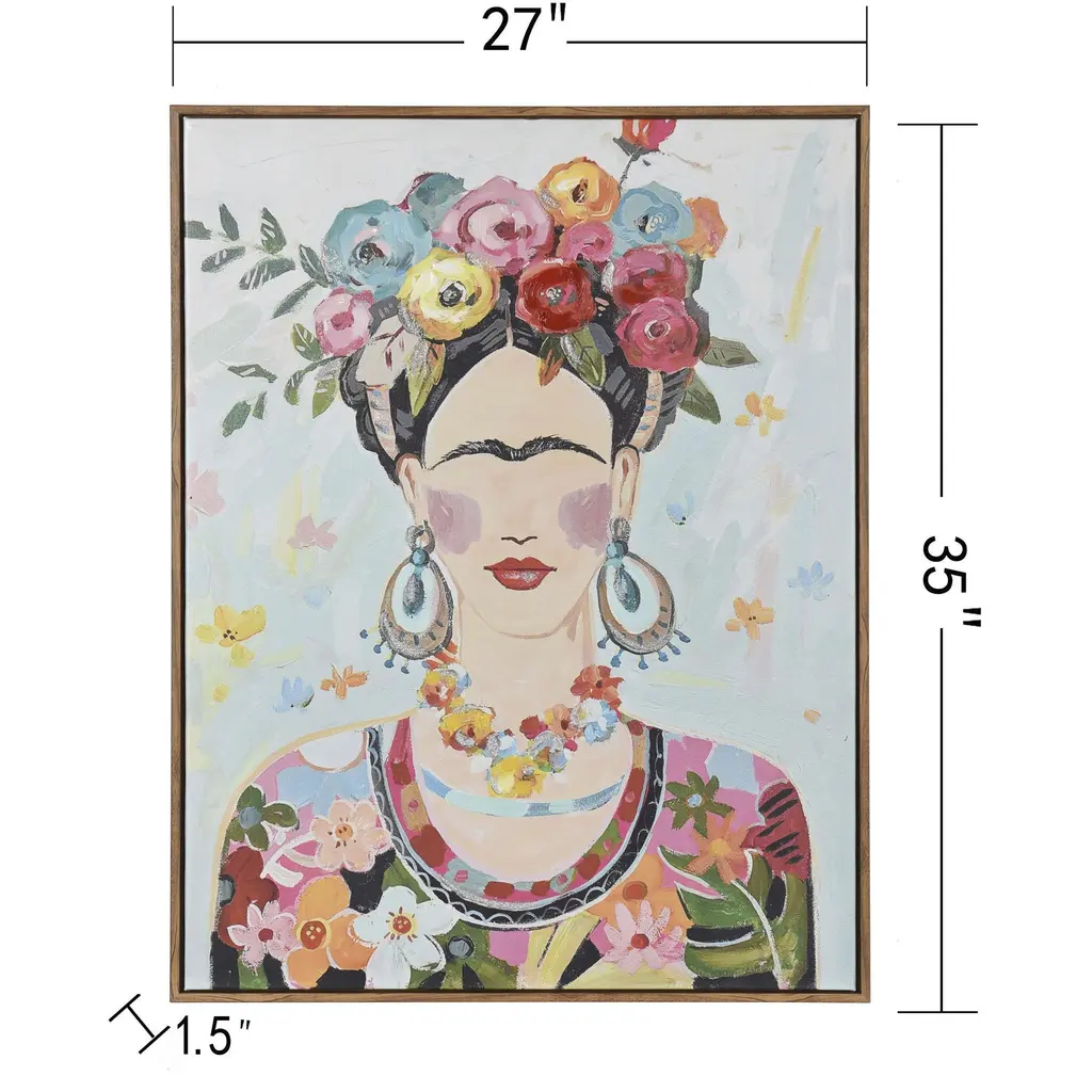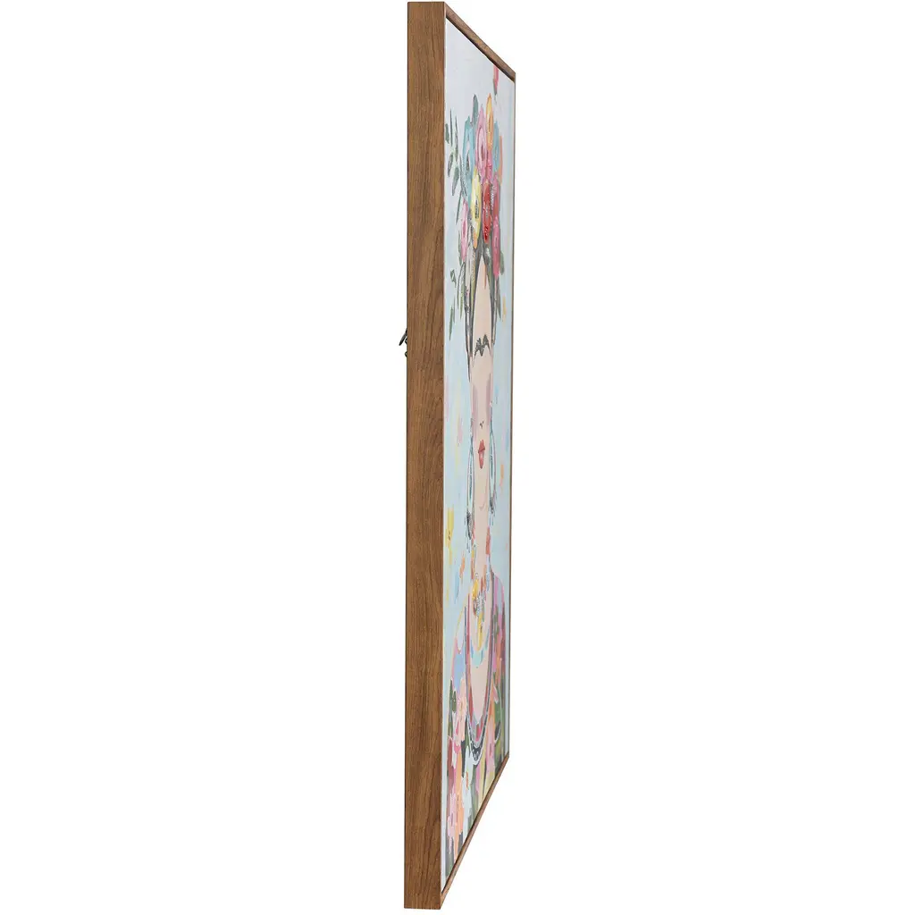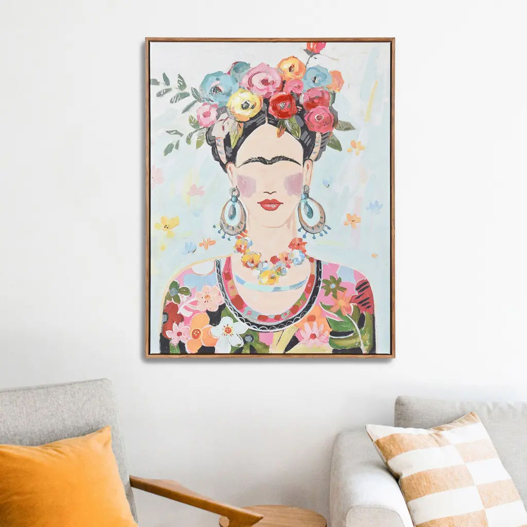 Boho Frida - Acrylic Hand Painted Lady Portrait Wall Art - Natural Wood Frame