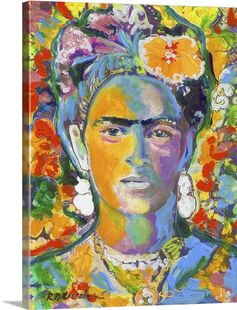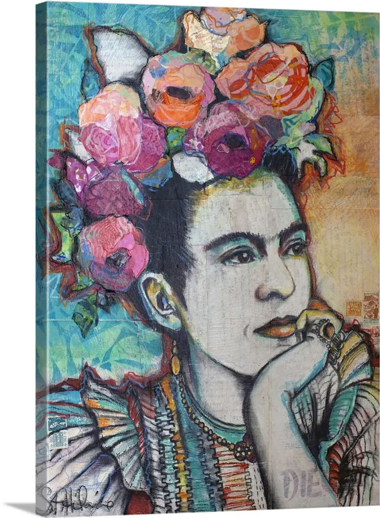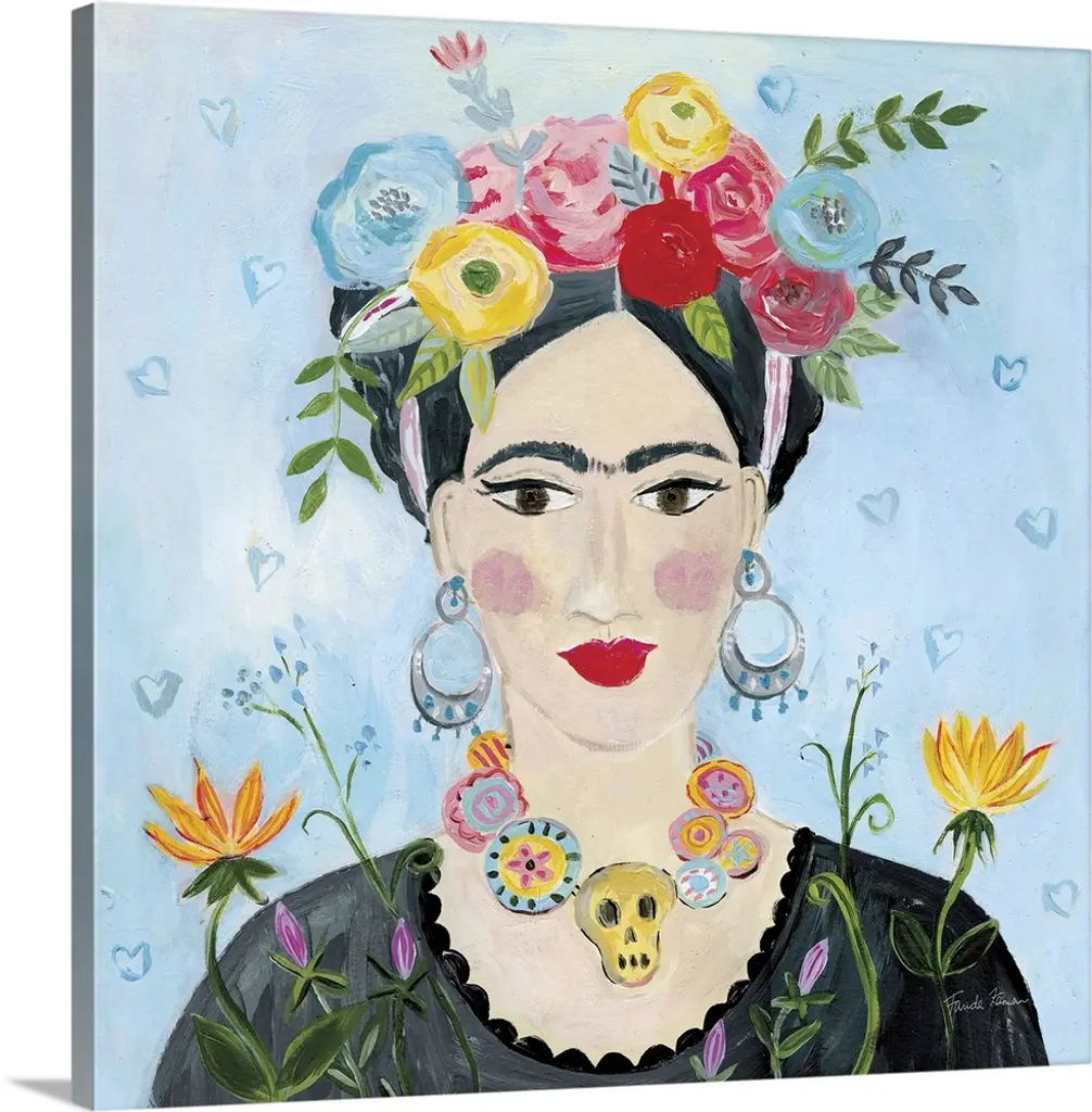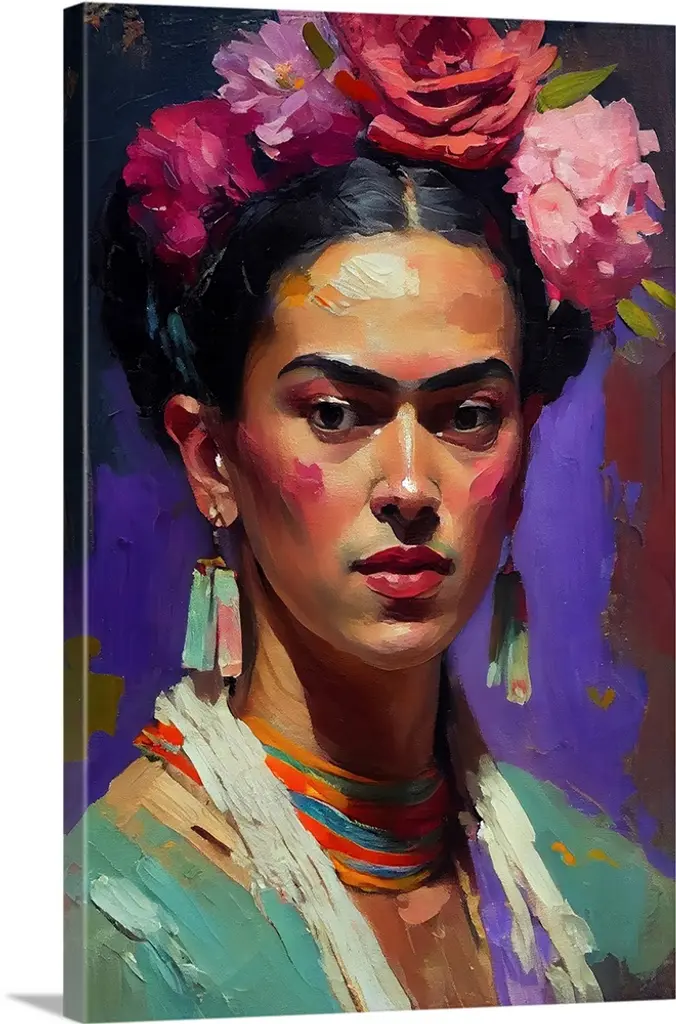 Boho Frida - Acrylic Hand Painted Lady Portrait Wall Art - Natural Wood Frame