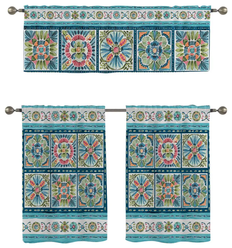 Add some bold colors to your room with the "Boho Plaza" kitchen tier. Bright colored tiles are topped with a beautiful watercolor pattern. Vibrant colors and teal accents are sprinkled throughout the pattern creating a mosaic design. This bohemian pattern is sure to give your room a fresh look. Artwork by Daphne Brissonnet, Presented by Laural Home®