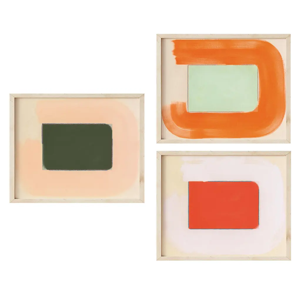 'Garden Trio' Fine Art Print Set by Emily Keating Snyder Prints are 30 x 38 in. each and framed in natural wood Printed on archival matte paper (no physical embroidery present in print) Overall framed dimensions are approximate. Frames are made with UV-shielding plexiglass. Artist Emily Keating Snyder incorporates embroidery into her colorful minimalist abstract paintings. Her archival fine art prints highlight the dimensional quality of the originals. Her work has been featured by Real Simple, Emily Henderson and Parachute Home.