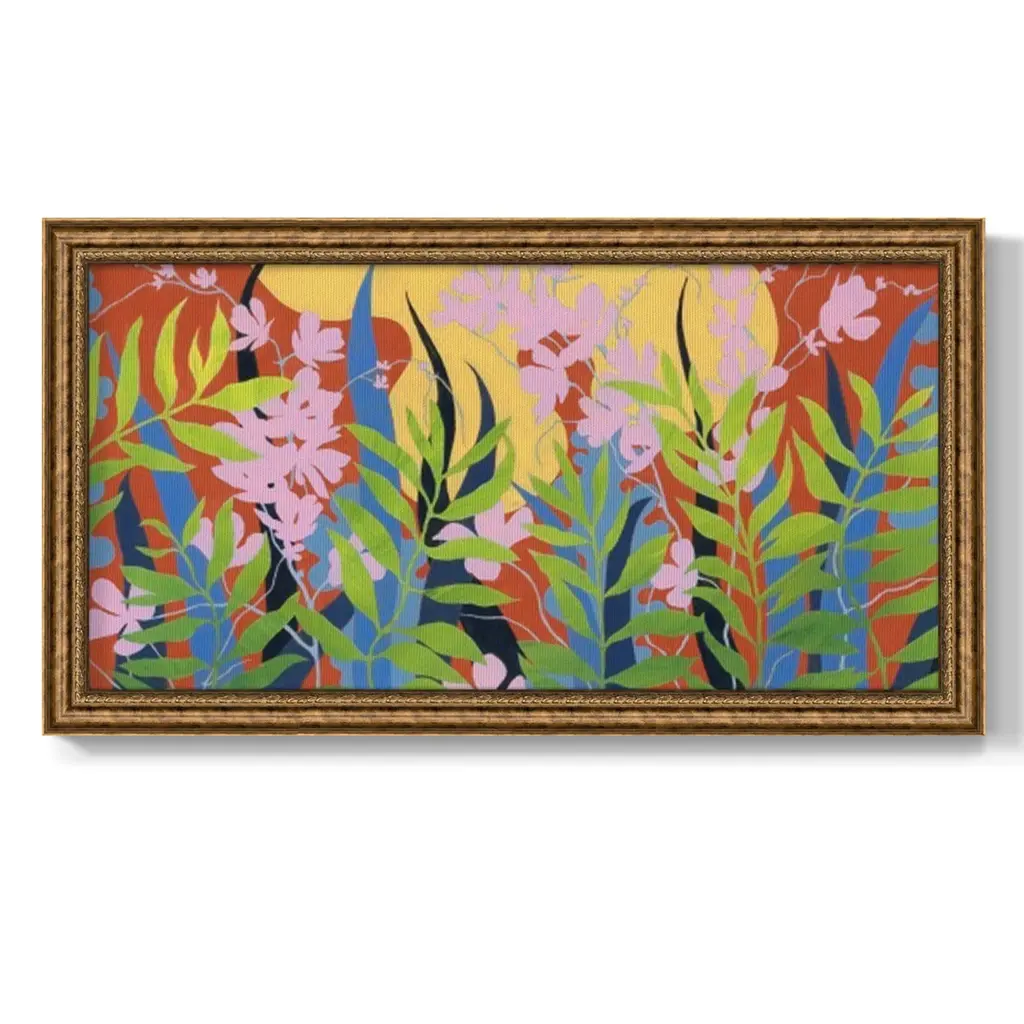 Bold Bright & Wild III Premium Framed Canvas- Ready to Hang A Premium Framed Canvas created to last. Framed in distressed wood and available in an array of sizes and colors Featuring a beveled a solid wood stretcher bar, each piece comes ready to hand 3 SIZES AVAILABLE 21''X37'' - Overall Size 25''X45'' - Overall Size 29''x53'' - Overall Size Each piece is made to order. Each piece comes with hanging hardware. Made in the USA Ready to Hang Giclee Paper Print Acrylic Glass Beveled Matt Board