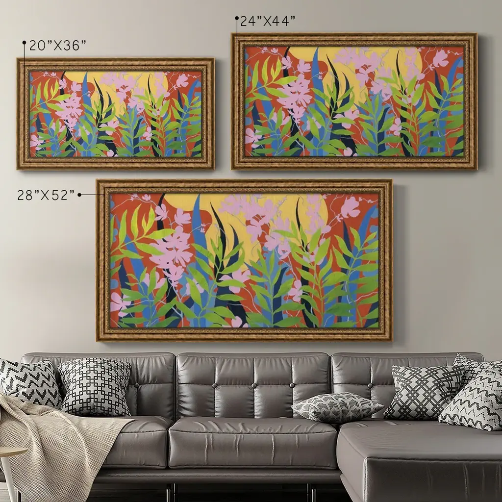 Bold Bright & Wild III Premium Framed Canvas- Ready to Hang A Premium Framed Canvas created to last. Framed in distressed wood and available in an array of sizes and colors Featuring a beveled a solid wood stretcher bar, each piece comes ready to hand 3 SIZES AVAILABLE 21''X37'' - Overall Size 25''X45'' - Overall Size 29''x53'' - Overall Size Each piece is made to order. Each piece comes with hanging hardware. Made in the USA Ready to Hang Giclee Paper Print Acrylic Glass Beveled Matt Board