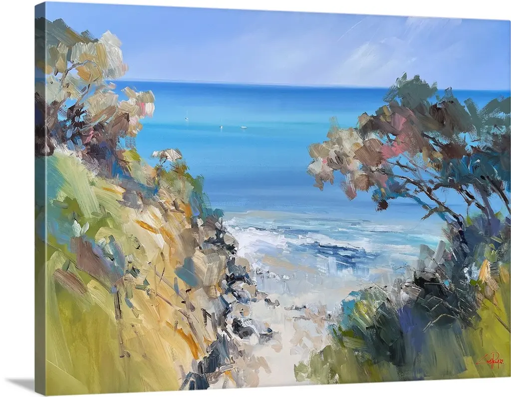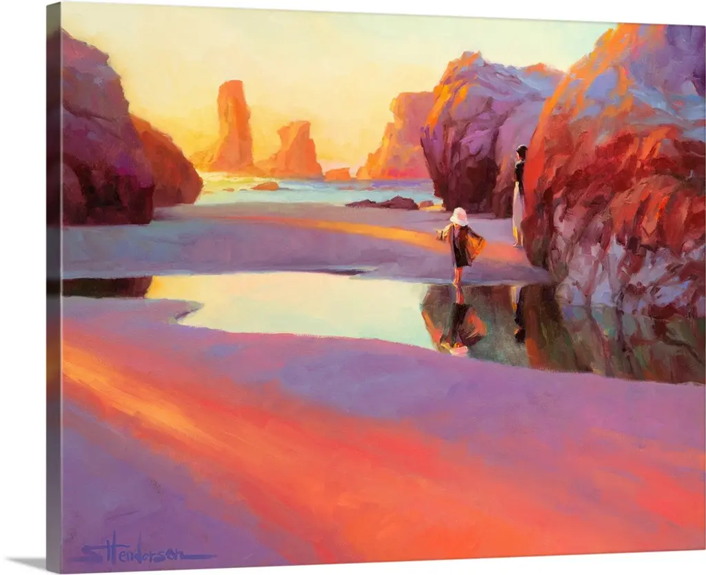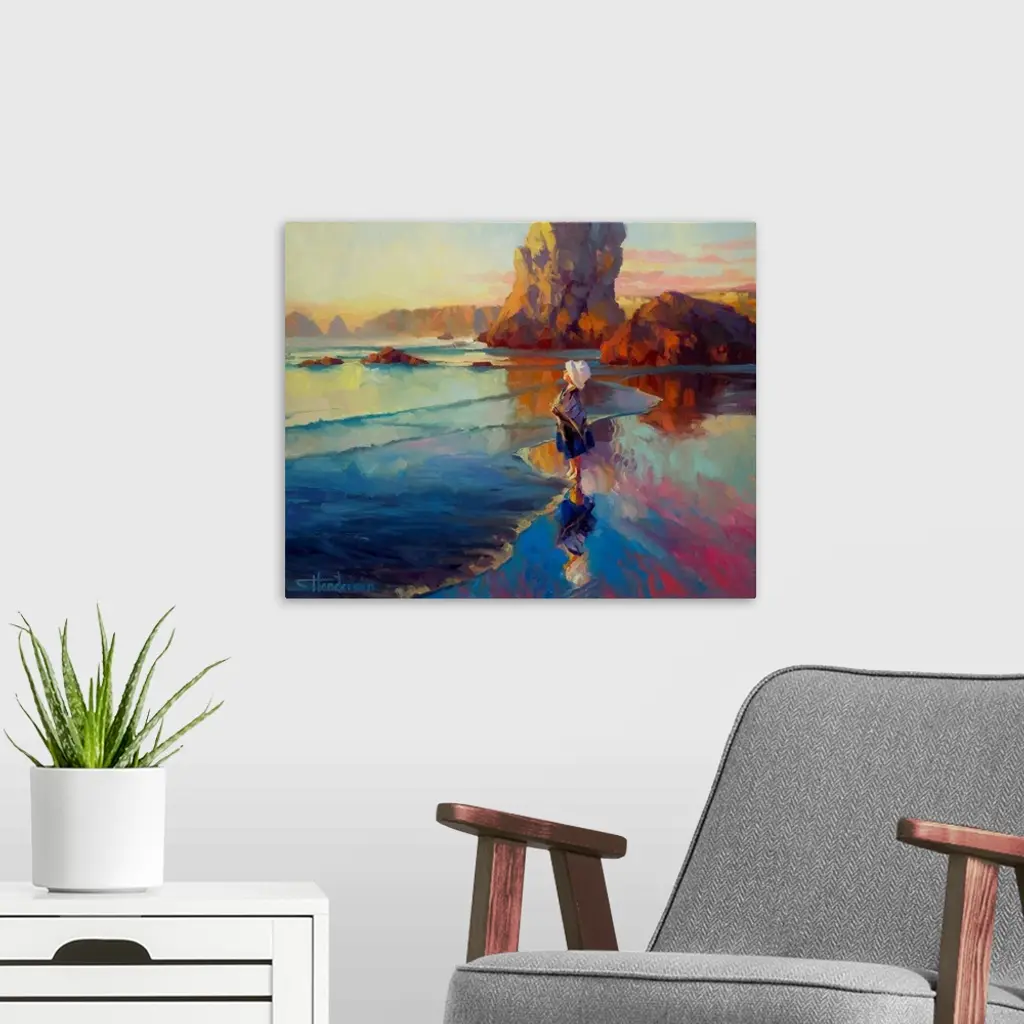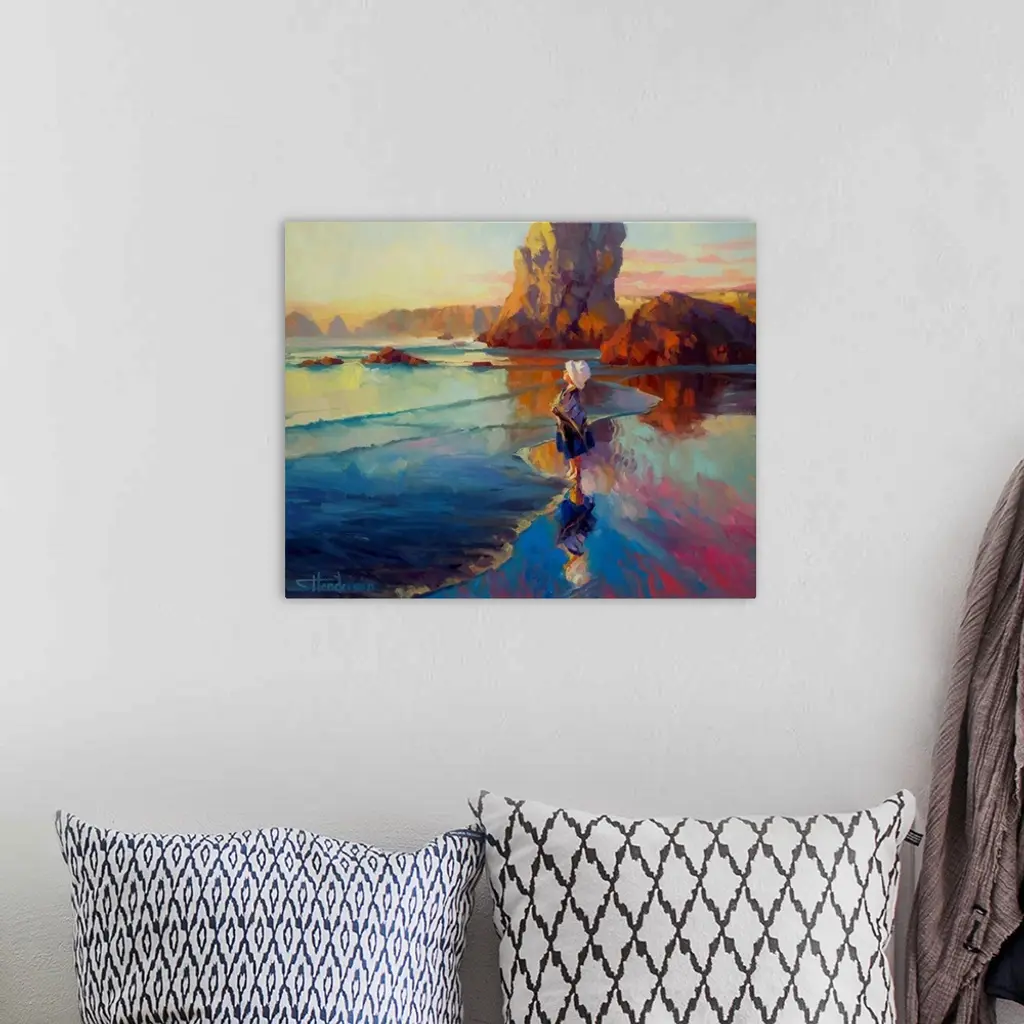 Traditional representational painting of a young child, wearing a hat, standing on the beach coast and looking out to the ocean