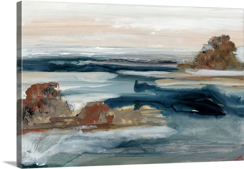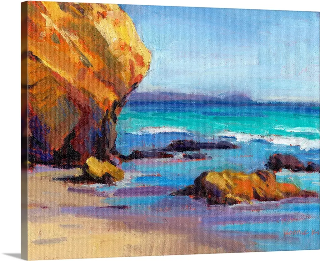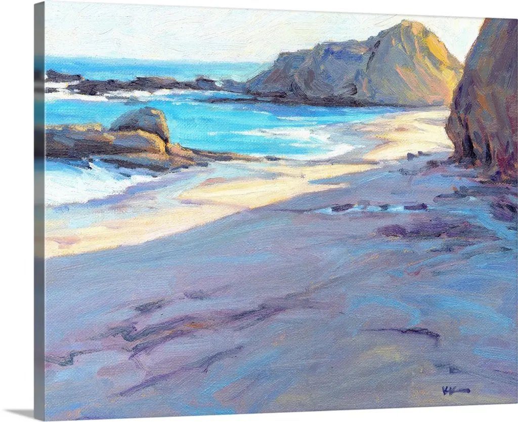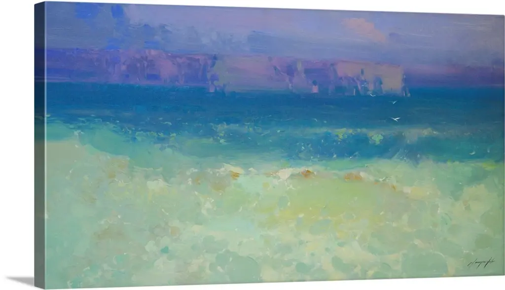 Traditional representational painting of a young child, wearing a hat, standing on the beach coast and looking out to the ocean