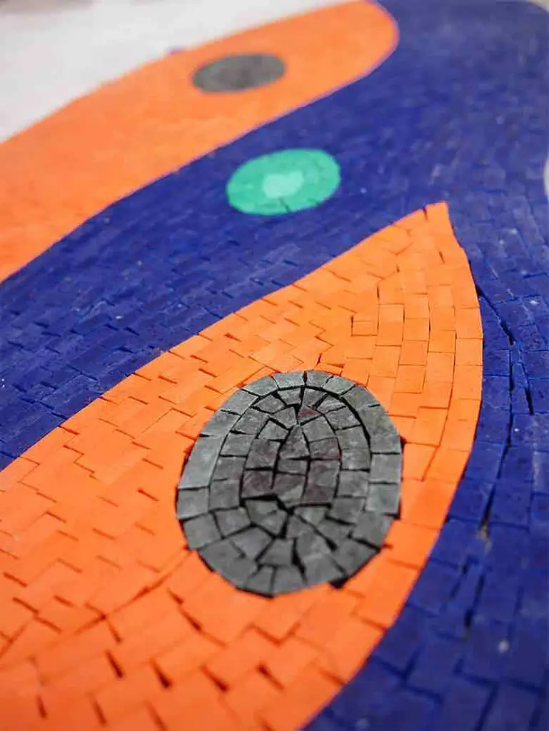 A visually striking square mosaic art piece depicts a butterfly with a dynamic and colorful wing design. The upper wings feature prominent sections of orange with black and green circular spots, contrasted by areas of black and yellow stripes. The lower wings showcase various shades of blue, accented with white and yellow edges and a light blue central area with a green spot. Crafted from hand-laid stone tiles, this artwork exemplifies detailed craftsmanship. The butterfly's antennae are depicted in a playful, curled black line, adding to the overall charm of this insect representation in stone.