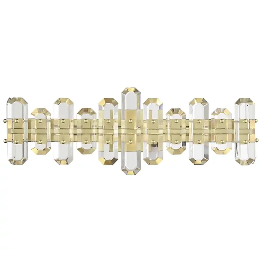The glamourous Bolton Vanity Light by Crystorama will elevate your bathroom to another luxurious level. This eye-catching piece is comprised of a row of large faceted crystal panels of varying sizes secured to a linear steel frame, creating a spellbinding display of gleaming luminosity. Each crystal prism reflects and refracts a warm glowing light from 3 incandescent bulbs, creating a calming and romantic ambiance ideal for any sized bathroom or vanity.