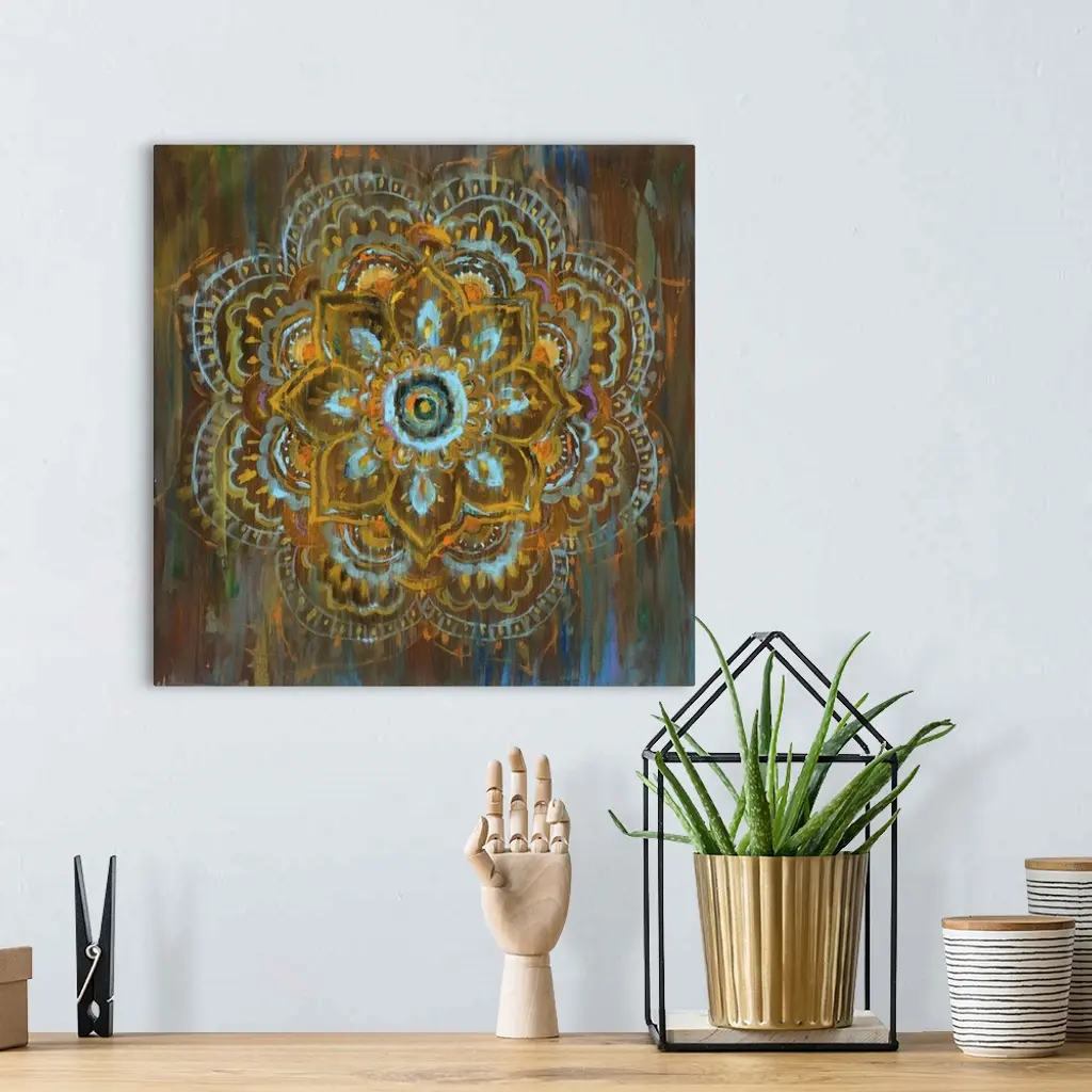 Square abstract painting of a flower mandala with blue, orange, yellow, and brown hues and hints of green and purple.