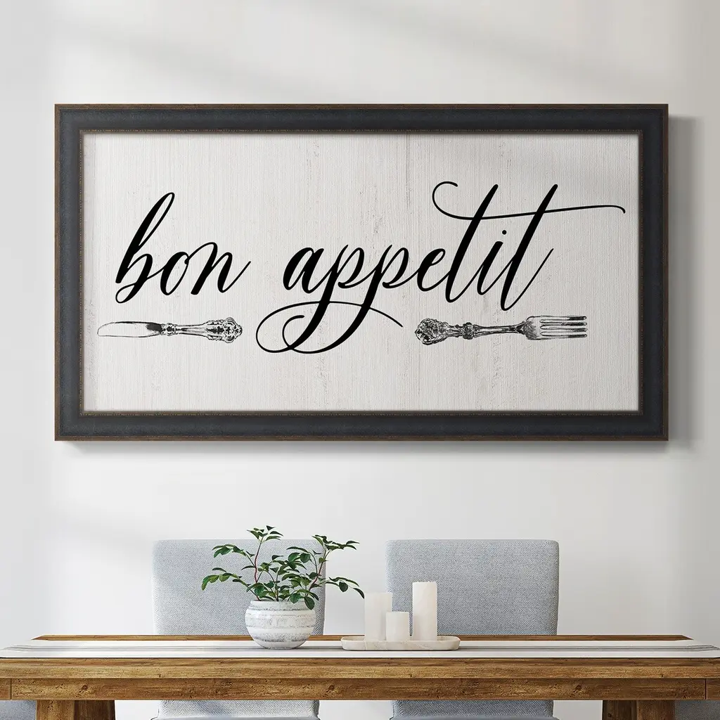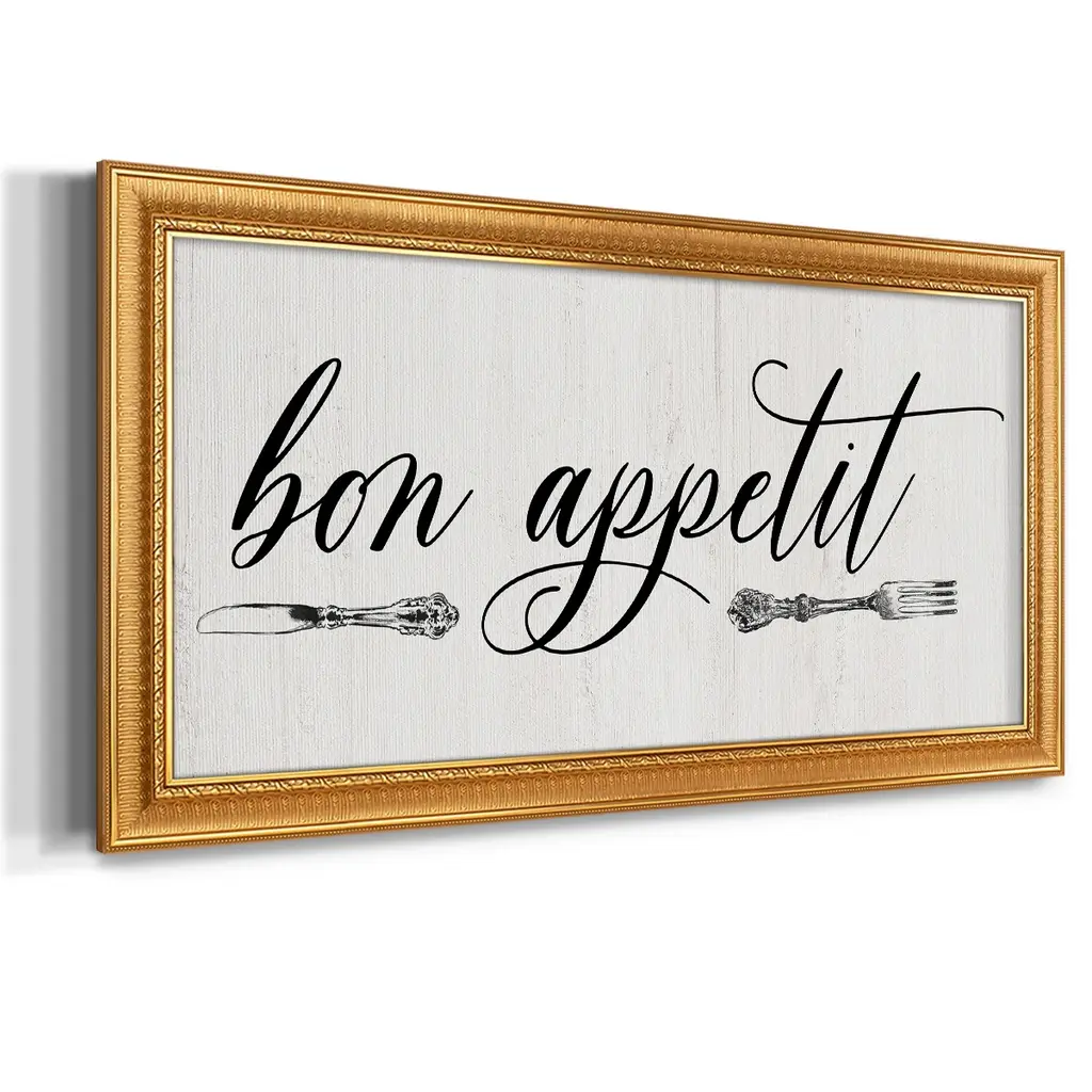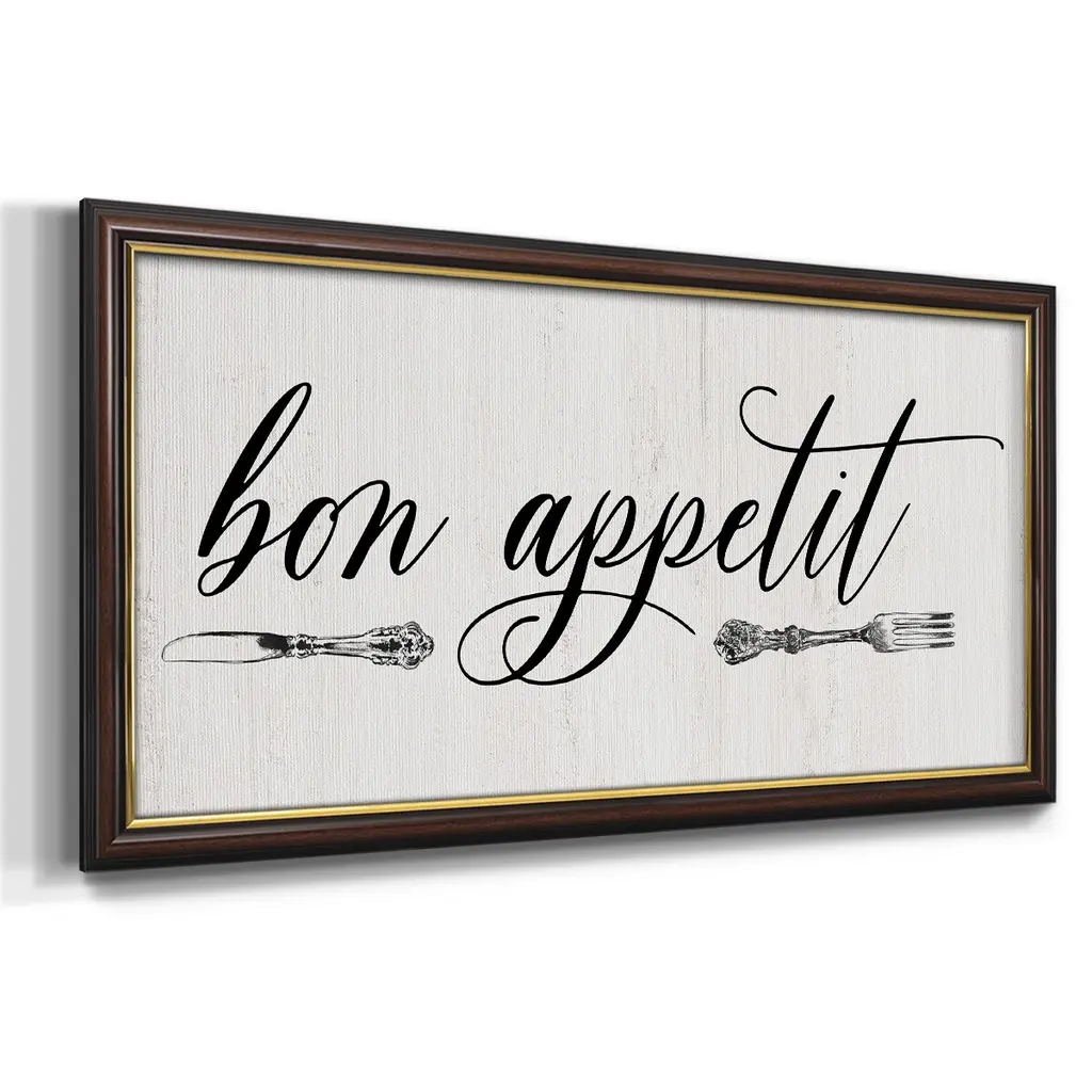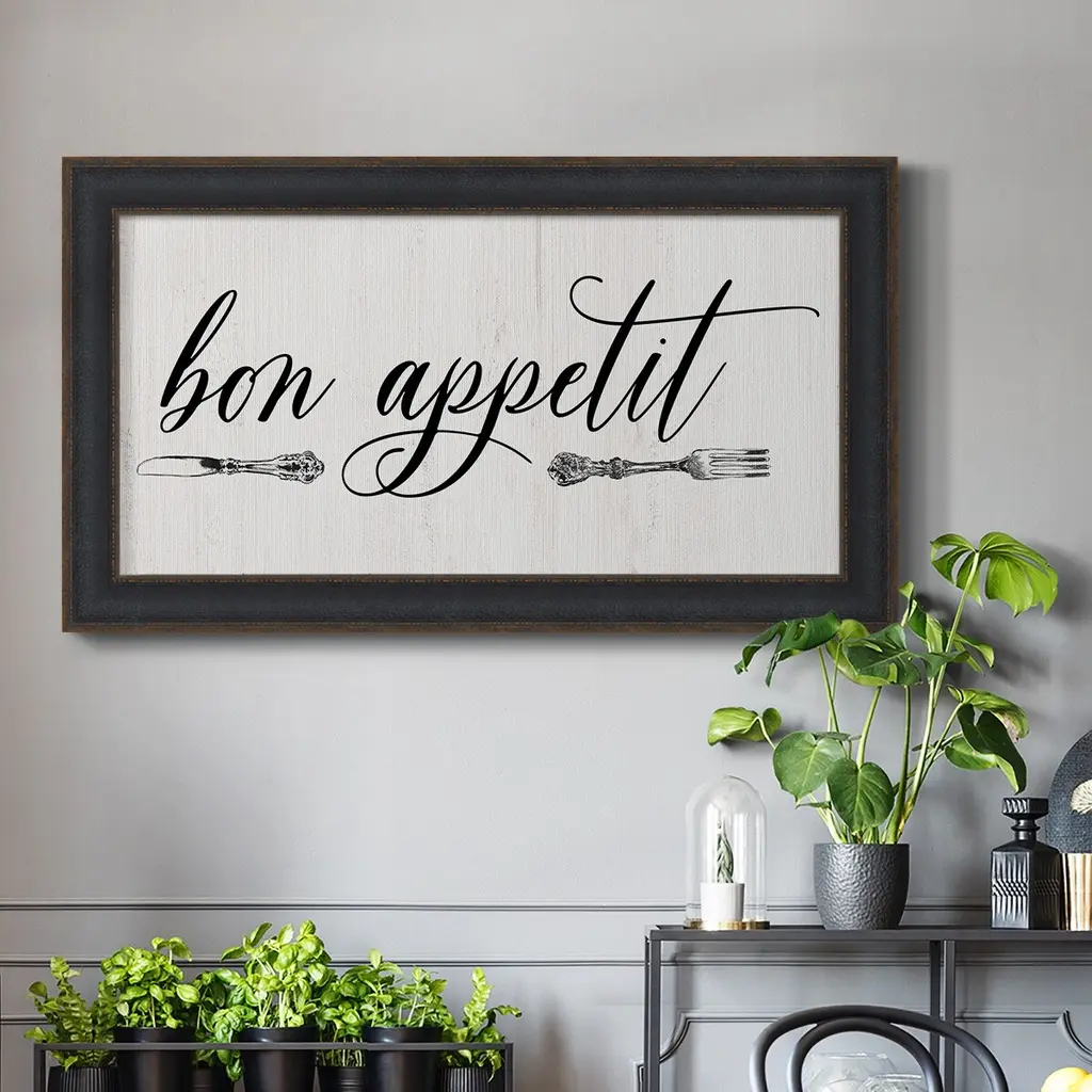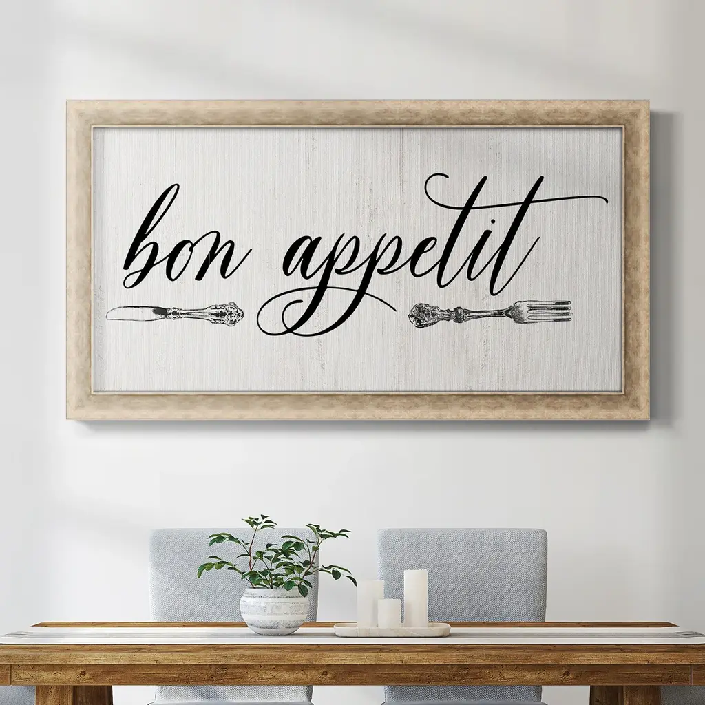 Bon Appetit Premium Framed Canvas- Ready to Hang A Premium Framed Canvas created to last. Framed in distressed wood and available in an array of sizes and colors Featuring a beveled a solid wood stretcher bar, each piece comes ready to hand 3 SIZES AVAILABLE 21''X37'' - Overall Size 25''X45'' - Overall Size 29''x53'' - Overall Size Each piece is made to order. Each piece comes with hanging hardware. Made in the USA Ready to Hang Giclee Paper Print Acrylic Glass Beveled Matt Board