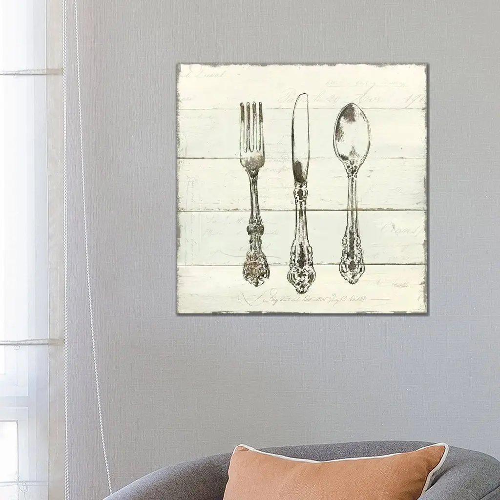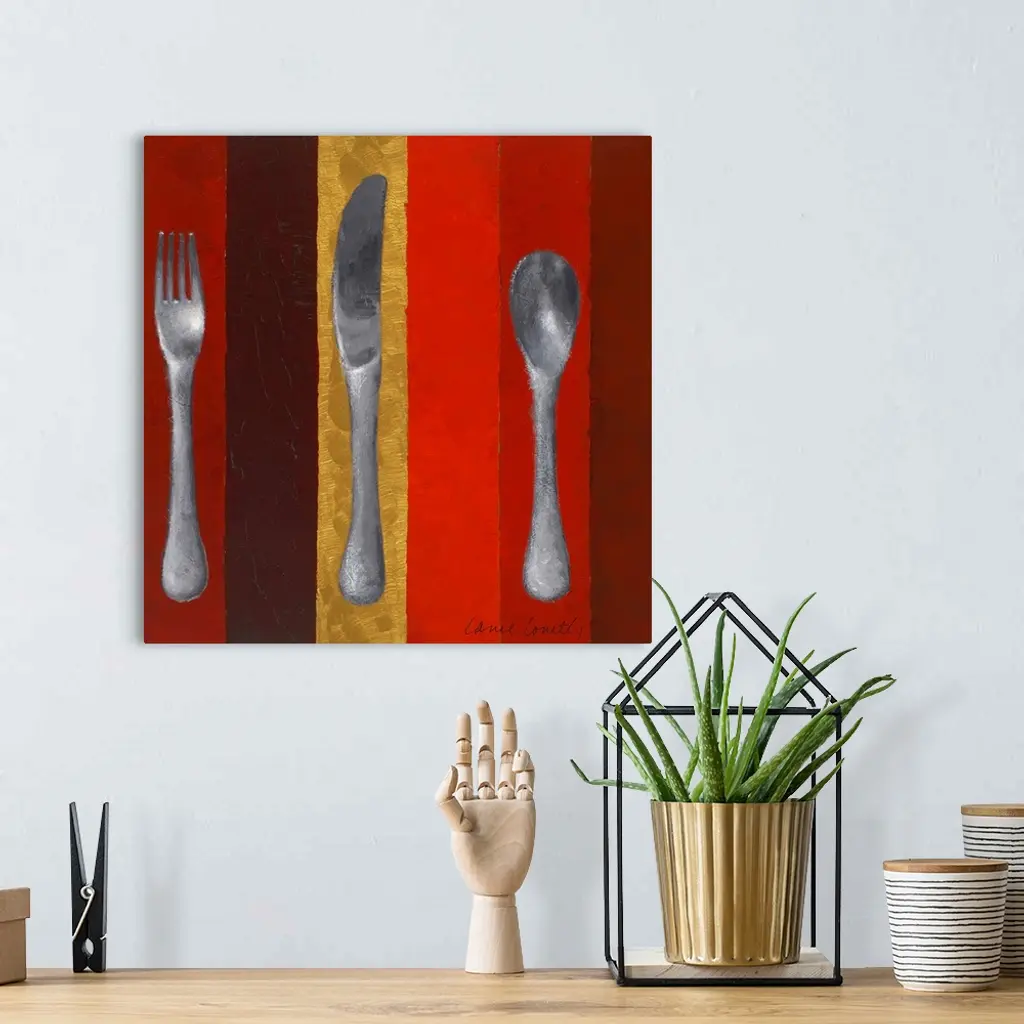 Large, square painting of six vertical strips of varying colors in warm tones, three of the strips from left to right have a fork, knife and spoon on them.