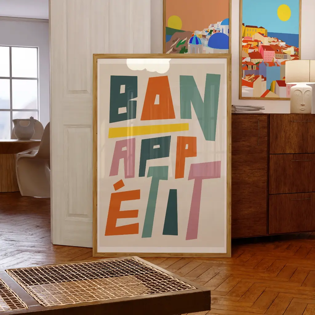 Bon Appetit Typography Art Print - A3Elevate your decor with this 'bon appetit' print. The typography and clean lines create a contemporary aesthetic that seamlessly blends with a variety of interior styles. Hang it in your kitchen or dining area to inspire a love for good food and create a welcoming atmosphere. All prints are digitally designed by myself and printed to order.Smooth fine art 230 gsm matte card. Printed with vivid colour and detail. Sold without a frame.