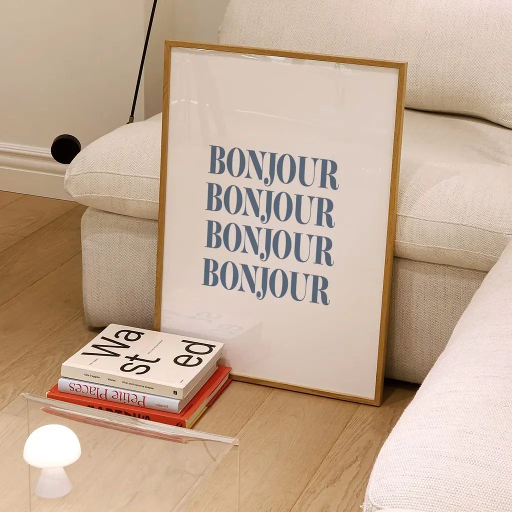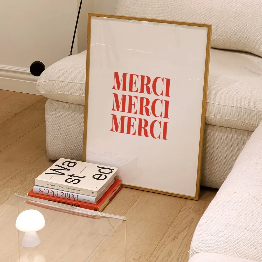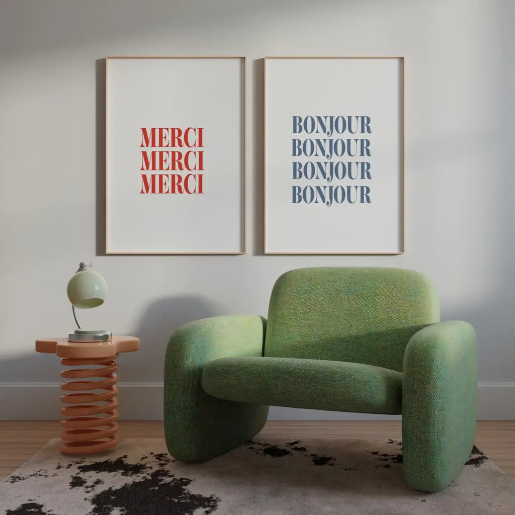Bonjour and Merci Art print set in A2.. A double dose of French slogans, our A2 art print set includes X2 prints.X1 A2 giclée printed Bonjour print in NavyX1 A2 giclée printed Merci print RedA perfect addition to any space, add a nostalgic playful element to your walls. Sold without frameGiclée printed on Munken pure smooth cream paper which is certified by the Rainforest Alliance Program for FSC® Standards.