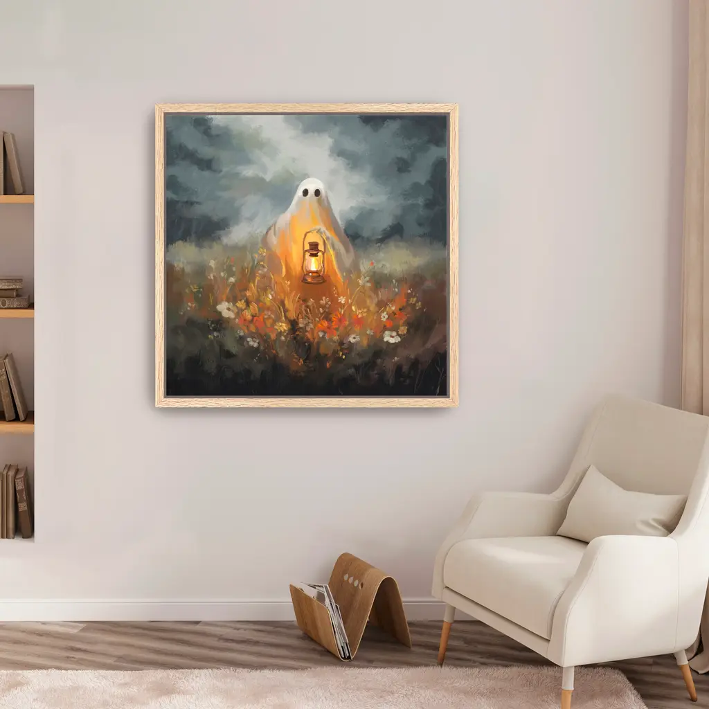 A lone ghost draped in white glows softly as it holds a lantern amid a field of autumn wildflowers. Moody hues of stormy gray, burnt orange, and golden amber create a haunting yet serene Halloween scene. Our Gallery Wrap Canvas Prints are proudly assembled with high quality materials in California, USA. Each piece is printed on a thick, archival grade canvas using Giclee technology. It is then hand-stretched by our experienced artisans over solid wood bars, which will not warp over time. The final product is a piece personally crafted for you to confidently display on your wall. Care and Assembly: Ensure that the location of your piece has little to no exposure to heat, sunlight, and moisture. Wipe clean, only if needed. Each piece includes hanging hardware to hang on your wall horizontally.