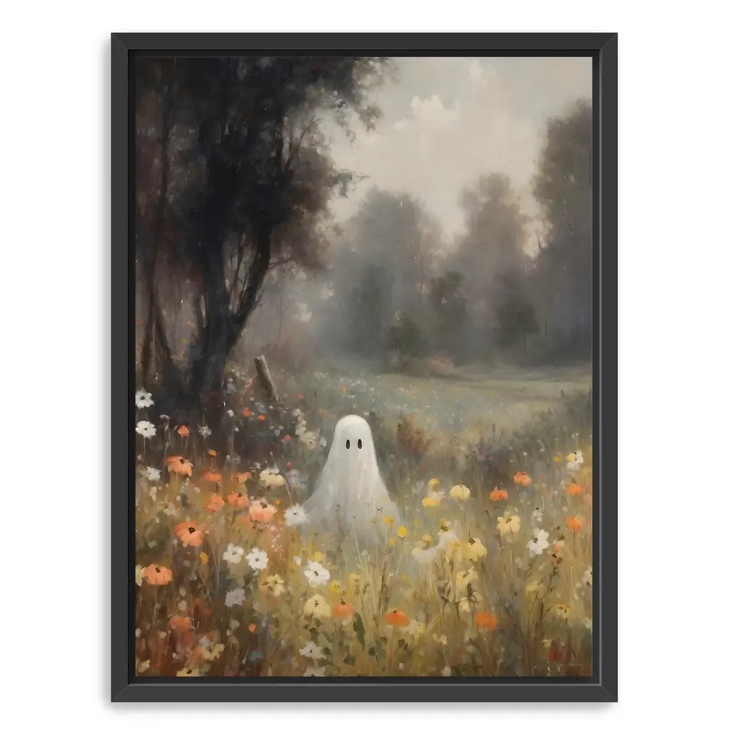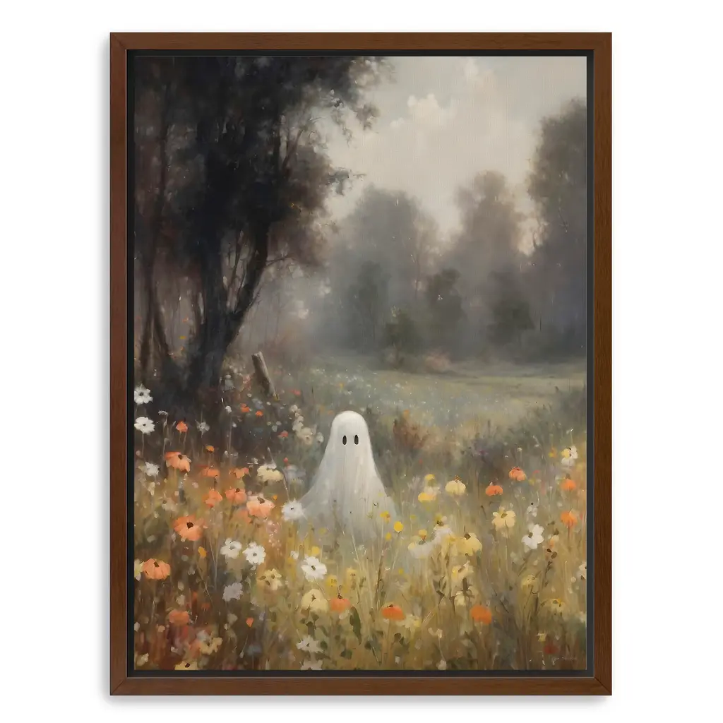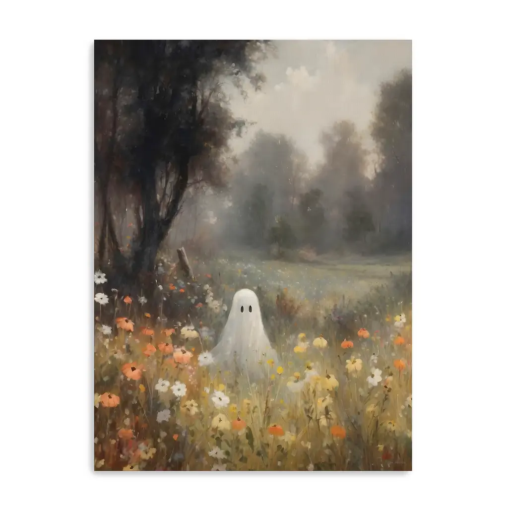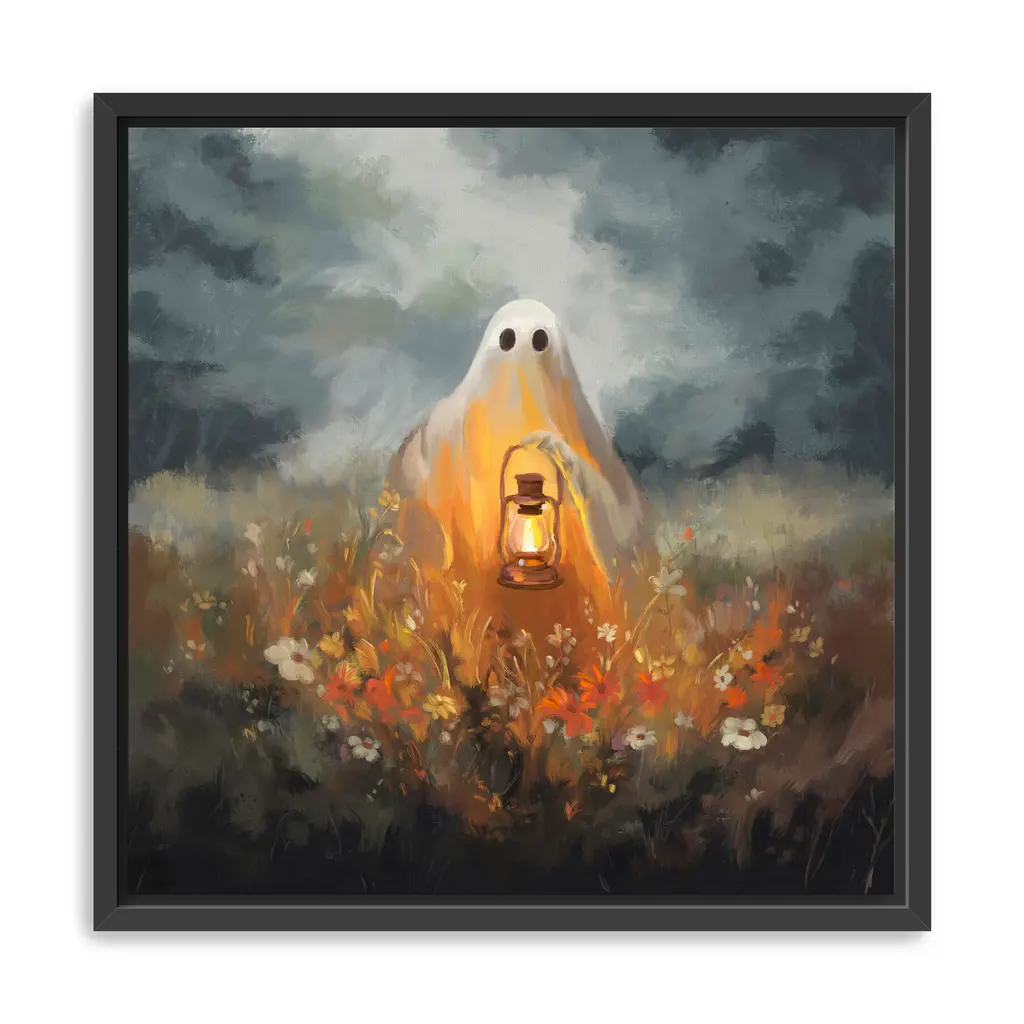 A lone ghost draped in white glows softly as it holds a lantern amid a field of autumn wildflowers. Moody hues of stormy gray, burnt orange, and golden amber create a haunting yet serene Halloween scene. Our Gallery Wrap Canvas Prints are proudly assembled with high quality materials in California, USA. Each piece is printed on a thick, archival grade canvas using Giclee technology. It is then hand-stretched by our experienced artisans over solid wood bars, which will not warp over time. The final product is a piece personally crafted for you to confidently display on your wall. Care and Assembly: Ensure that the location of your piece has little to no exposure to heat, sunlight, and moisture. Wipe clean, only if needed. Each piece includes hanging hardware to hang on your wall horizontally.