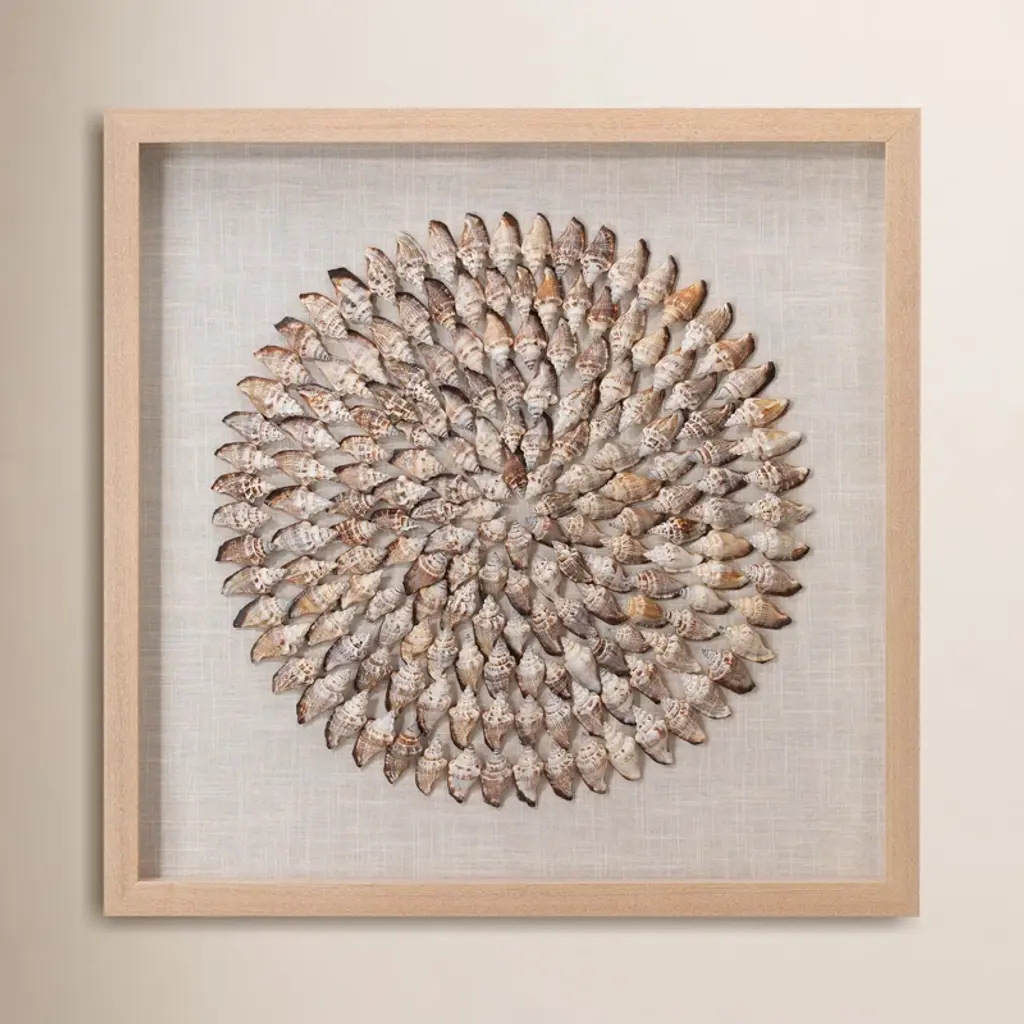 The Bora Bora Wall Art by Jamie Young Co. showcases the mesmerizing organic beauty of natural screw shells arranged into shrinking concentric circles. With a stunning range of seaside colors and textures, it brings the essence of coastal charm into any space. Each piece is meticulously handcrafted using natural materials and framed in wood, ensuring its distinctiveness. Make a statement in your entryway, powder room, or bedroom with this earthy and eye-catching accent.