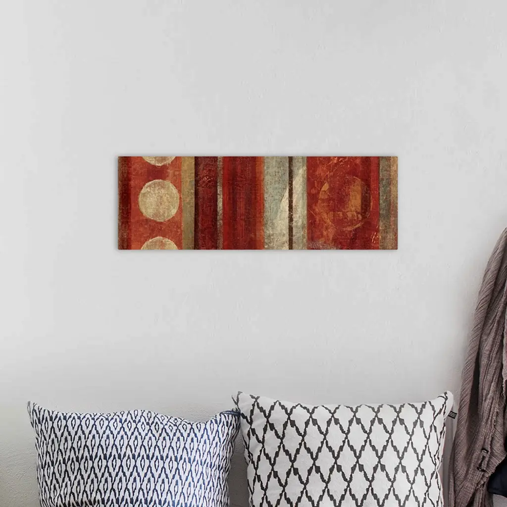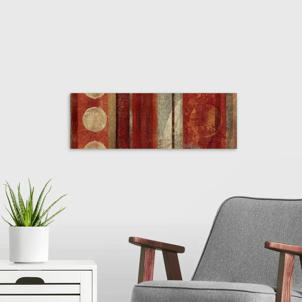 Abstract painting with circles against vertical stripes in earthy tones.