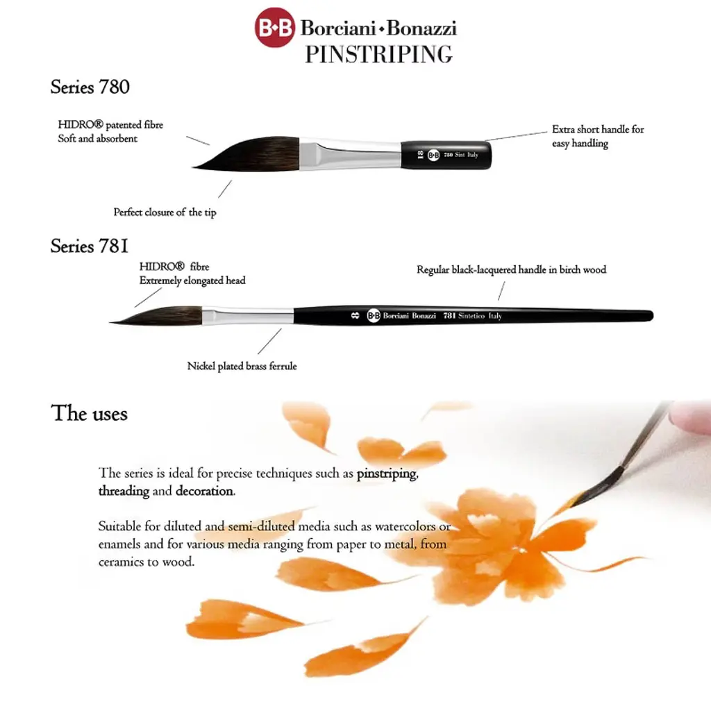 Borciani Bonazzi Hidro Synthetic Sword Striper Liner Brushes For Fine Lines & Lettering - Sizes 18 - Extra Short Handle, Handcrafted In Italy,