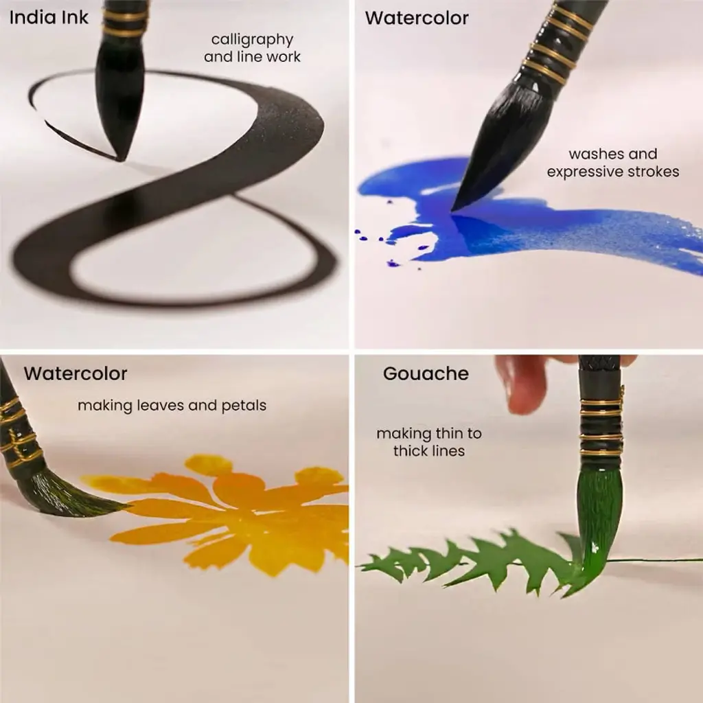 Introducing the Infinito Synthetic Quill brush by Borciani Bonazzi, a pinnacle of craftsmanship in the realm of professional watercolor brushes. Designed for the discerning artist, this exquisite tool combines elegance, functionality, and innovation to elevate your watercolor artistry to new heights. Handcrafted in Italy by skilled artisans, each brush embodies the rich heritage and precision synonymous with Borciani Bonazzi, a brand that stands as a testament to quality and artistry. The Infinito Synthetic Quill features patented HIDRO® synthetic hair, a breakthrough in brush technology that mimics the absorbency and softness of natural sable brushes. These synthetic watercolor brushes are engineered to deliver unparalleled performance, allowing artists to achieve both intricate details and broad washes with ease. The highly absorbent bristles are designed to release color slowly, providing a consistent and smooth application that professional watercolor brushes demand. The distinctive quill shape is one of the standout features of this watercolor brush. It expands under pressure, offering expressive strokes that are ideal for a variety of techniques, from calligraphy and script to free-flowing line work. The flame-shaped quill tuft is highly responsive, making it perfect for both fine details and sweeping washes. Available in three distinct shapes—quill, mini quill, and quill liner—this watercolor brush set caters to the diverse needs of watercolor artists, whether engaged in plein air or urban sketching. The ergonomic handle of these watercolor paint brushes for adults is medium-length, providing the perfect balance to reduce hand strain. Its textured, non-slip design ensures a comfortable grip, minimizing fatigue during long creative sessions. The double brass wirebound ferrule adds durability, while the anti-roll design keeps your artist paint brushes securely in place.