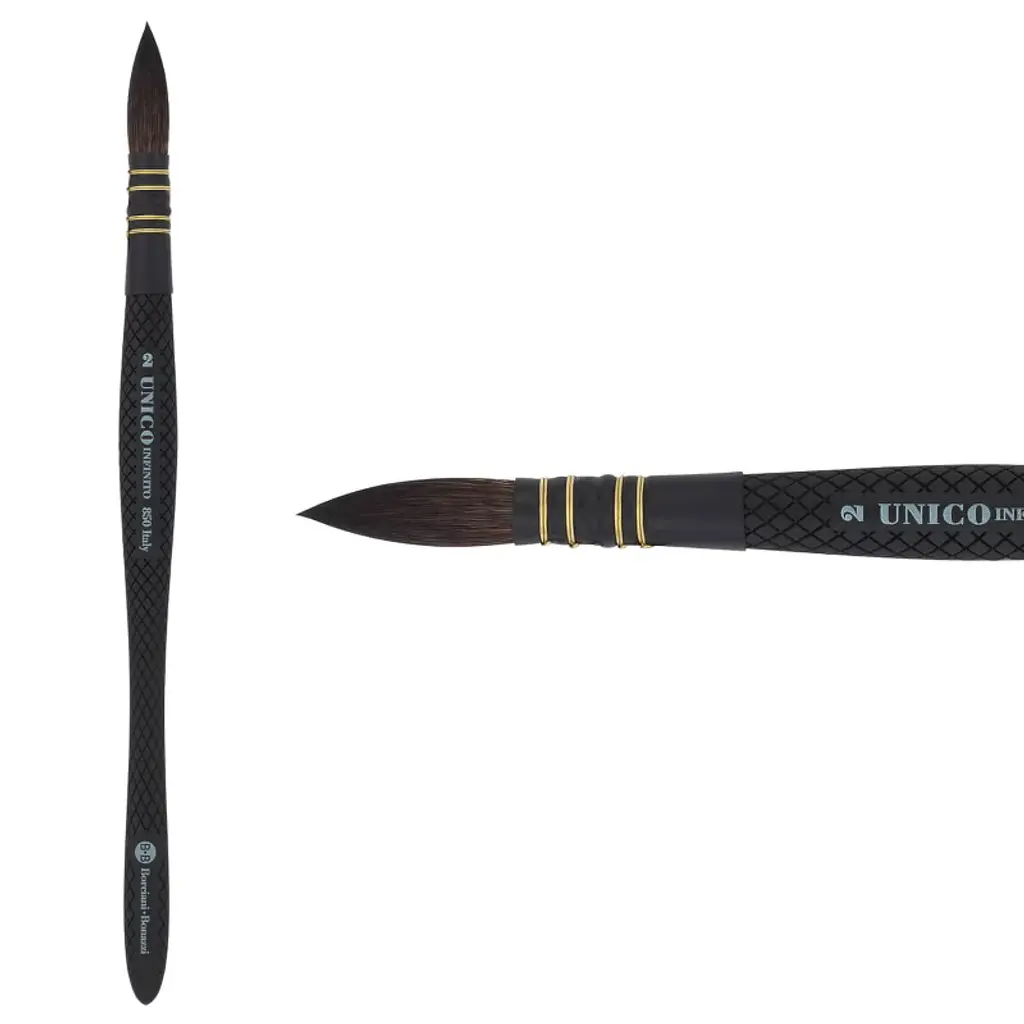 Introducing the Infinito Synthetic Quill brush by Borciani Bonazzi, a pinnacle of craftsmanship in the realm of professional watercolor brushes. Designed for the discerning artist, this exquisite tool combines elegance, functionality, and innovation to elevate your watercolor artistry to new heights. Handcrafted in Italy by skilled artisans, each brush embodies the rich heritage and precision synonymous with Borciani Bonazzi, a brand that stands as a testament to quality and artistry. The Infinito Synthetic Quill features patented HIDRO® synthetic hair, a breakthrough in brush technology that mimics the absorbency and softness of natural sable brushes. These synthetic watercolor brushes are engineered to deliver unparalleled performance, allowing artists to achieve both intricate details and broad washes with ease. The highly absorbent bristles are designed to release color slowly, providing a consistent and smooth application that professional watercolor brushes demand. The distinctive quill shape is one of the standout features of this watercolor brush. It expands under pressure, offering expressive strokes that are ideal for a variety of techniques, from calligraphy and script to free-flowing line work. The flame-shaped quill tuft is highly responsive, making it perfect for both fine details and sweeping washes. Available in three distinct shapes—quill, mini quill, and quill liner—this watercolor brush set caters to the diverse needs of watercolor artists, whether engaged in plein air or urban sketching. The ergonomic handle of these watercolor paint brushes for adults is medium-length, providing the perfect balance to reduce hand strain. Its textured, non-slip design ensures a comfortable grip, minimizing fatigue during long creative sessions. The double brass wirebound ferrule adds durability, while the anti-roll design keeps your artist paint brushes securely in place.