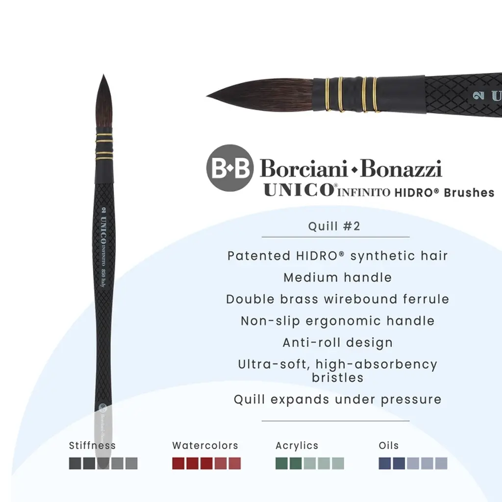 Borciani Bonazzi Infinito Synthetic Quill Watercolor Brush - Size # 2 W/ Patented Responsive Hidro® Hair - Watercolor Brushes For Artists - Textured