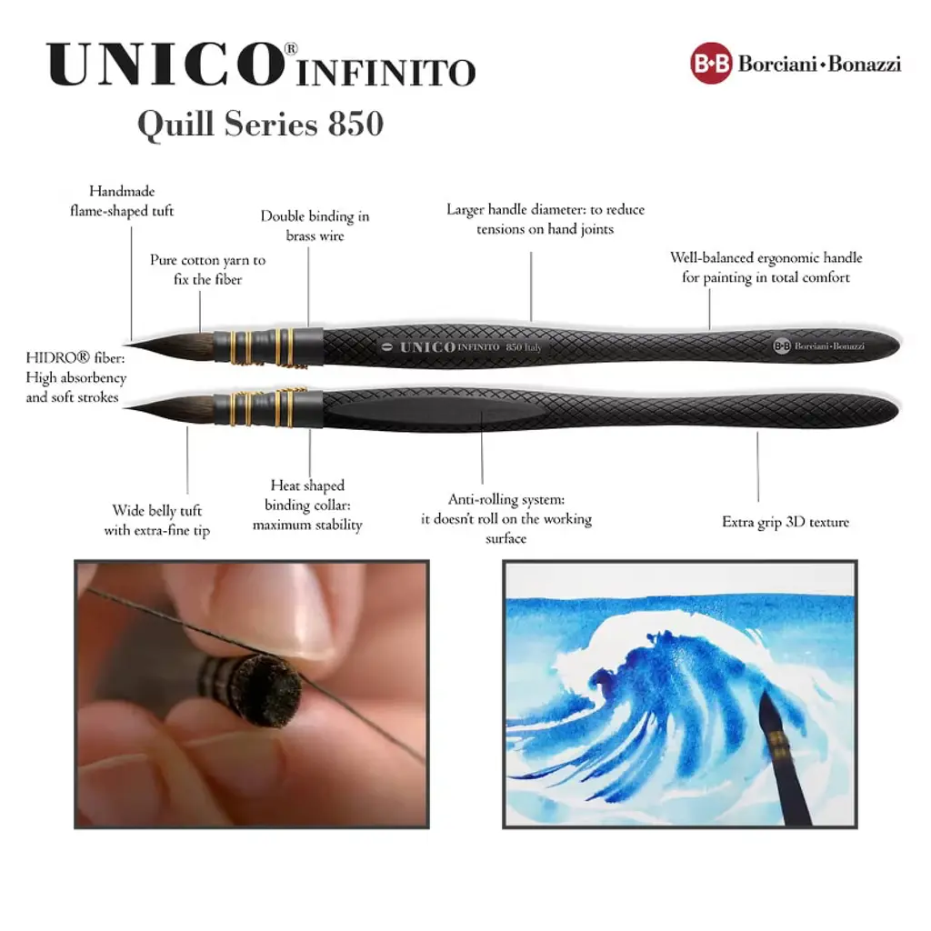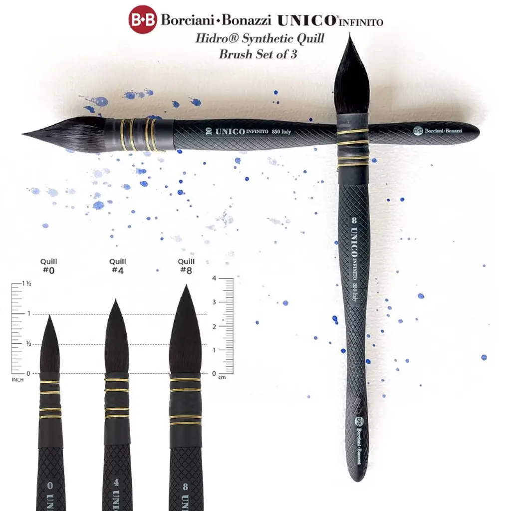 Introducing the Infinito Synthetic Quill brush by Borciani Bonazzi, a pinnacle of craftsmanship in the realm of professional watercolor brushes. Designed for the discerning artist, this exquisite tool combines elegance, functionality, and innovation to elevate your watercolor artistry to new heights. Handcrafted in Italy by skilled artisans, each brush embodies the rich heritage and precision synonymous with Borciani Bonazzi, a brand that stands as a testament to quality and artistry. The Infinito Synthetic Quill features patented HIDRO® synthetic hair, a breakthrough in brush technology that mimics the absorbency and softness of natural sable brushes. These synthetic watercolor brushes are engineered to deliver unparalleled performance, allowing artists to achieve both intricate details and broad washes with ease. The highly absorbent bristles are designed to release color slowly, providing a consistent and smooth application that professional watercolor brushes demand. The distinctive quill shape is one of the standout features of this watercolor brush. It expands under pressure, offering expressive strokes that are ideal for a variety of techniques, from calligraphy and script to free-flowing line work. The flame-shaped quill tuft is highly responsive, making it perfect for both fine details and sweeping washes. Available in three distinct shapes—quill, mini quill, and quill liner—this watercolor brush set caters to the diverse needs of watercolor artists, whether engaged in plein air or urban sketching. The ergonomic handle of these watercolor paint brushes for adults is medium-length, providing the perfect balance to reduce hand strain. Its textured, non-slip design ensures a comfortable grip, minimizing fatigue during long creative sessions. The double brass wirebound ferrule adds durability, while the anti-roll design keeps your artist paint brushes securely in place.