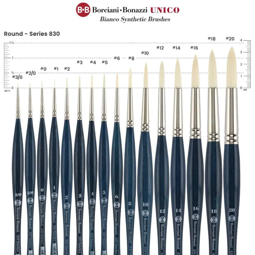 Introducing the Borciani Bonazzi UNICO Bianco Synthetic Series, a masterpiece for those serious about painting and crafting. This handcrafted brush, proudly made in Italy, embodies precision and craftsmanship, designed to elevate your artistic endeavors across various media, including oil painting, textured gels, and thick acrylics. With its ergonomic handle and anti-roll design, this brush offers comfort and control, allowing for bold strokes and rich textures in every piece of art, from painting canvases to miniature painting. The Borciani Bonazzi Series 830 brush features extra-strong, animal-friendly synthetic bristles that mimic the natural properties of hog bristles. The stiffness and absorbency of the interlocking hair allow for high-impact painting while maintaining their shape, even when used with heavy-bodied oils and acrylics. This makes it an ideal choice for artists who require durability and versatility in their tools, particularly those working with thick mediums or layers. The brass ferrule ensures a robust connection between the bristles and handle, promising longevity and reliability. Suitable for both beginners and seasoned artists, this brush performs exceptionally well with acrylic paint sets, oils, and even model paint for detailed projects. Its animal-friendly design makes it a conscientious choice for environmentally aware artists. Beyond its technical specifications, the Borciani Bonazzi Series 830 is more than just a tool; it's an extension of your artistic vision. Whether you are a professional artist or a hobbyist crafting your latest project with a paint-by-number kit, the Borciani Bonazzi Series ensures every stroke is executed with finesse and clarity. Experience the artistry of handcrafted Italian brushes and see your creations come to life with unmatched precision and depth.