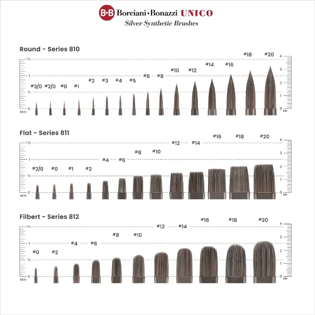 Introducing the Borciani Bonazzi UNICO Silver Synthetic Series 812 Medium Handle Brush series, a masterpiece in the world of painting, drawing & art supplies. This brush is designed to meet the meticulous demands of artists who work with paints or a variety of other mediums. Handcrafted in Italy, it is an exemplary representation of balance, precision, and elasticity, offering artists a seamless experience whether working with watercolors, acrylics, or oils. The unique features of this brush include micro-perforated synthetic hairs that absorb and gradually release water, allowing for smooth, controlled strokes. This elasticity is ideal for artists seeking an animal-friendly brush alternative without compromising on performance. The medium-length handle is ergonomically designed to reduce hand strain, allowing for easy control during extended painting sessions. Additionally, the anti-roll design ensures that your brush stays put when you need to take a break. Suitable for both fluid and heavy-bodied paints, this brush excels in effortless color application, allowing artists to achieve the desired effects with minimal effort. The synthetic hair is crafted to hold its shape even after extensive use, ensuring that your brush remains a reliable tool in your art arsenal. The brass ferrules are not only aesthetically pleasing but also contribute to the brush's durability and balance. Moreover, this brush's versatility extends beyond traditional canvas painting. It is equally adept at handling tasks such as a face painting brush or even as a detailing brush for ceramics. The Borciani Bonazzi UNICO Silver Synthetic Series 812 is not just a brush; it's an extension of your creative expression, offering a harmonious blend of craftsmanship and innovation tailored to every artist's needs.